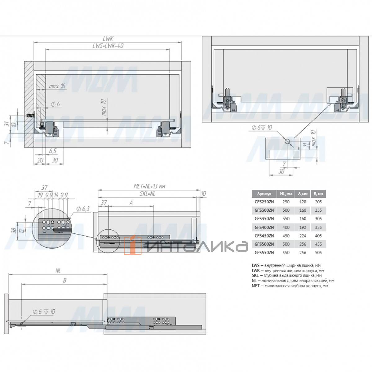 VEKTOR GFS направляющие 350 мм, ниж. крепления, полн. выдвижения, плав. закрывания (GFS350ZN), GFS350ZN