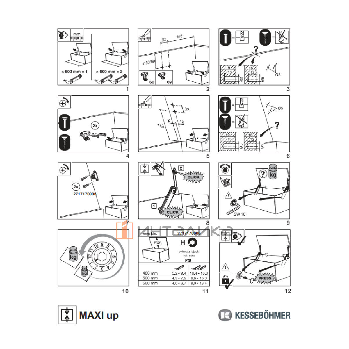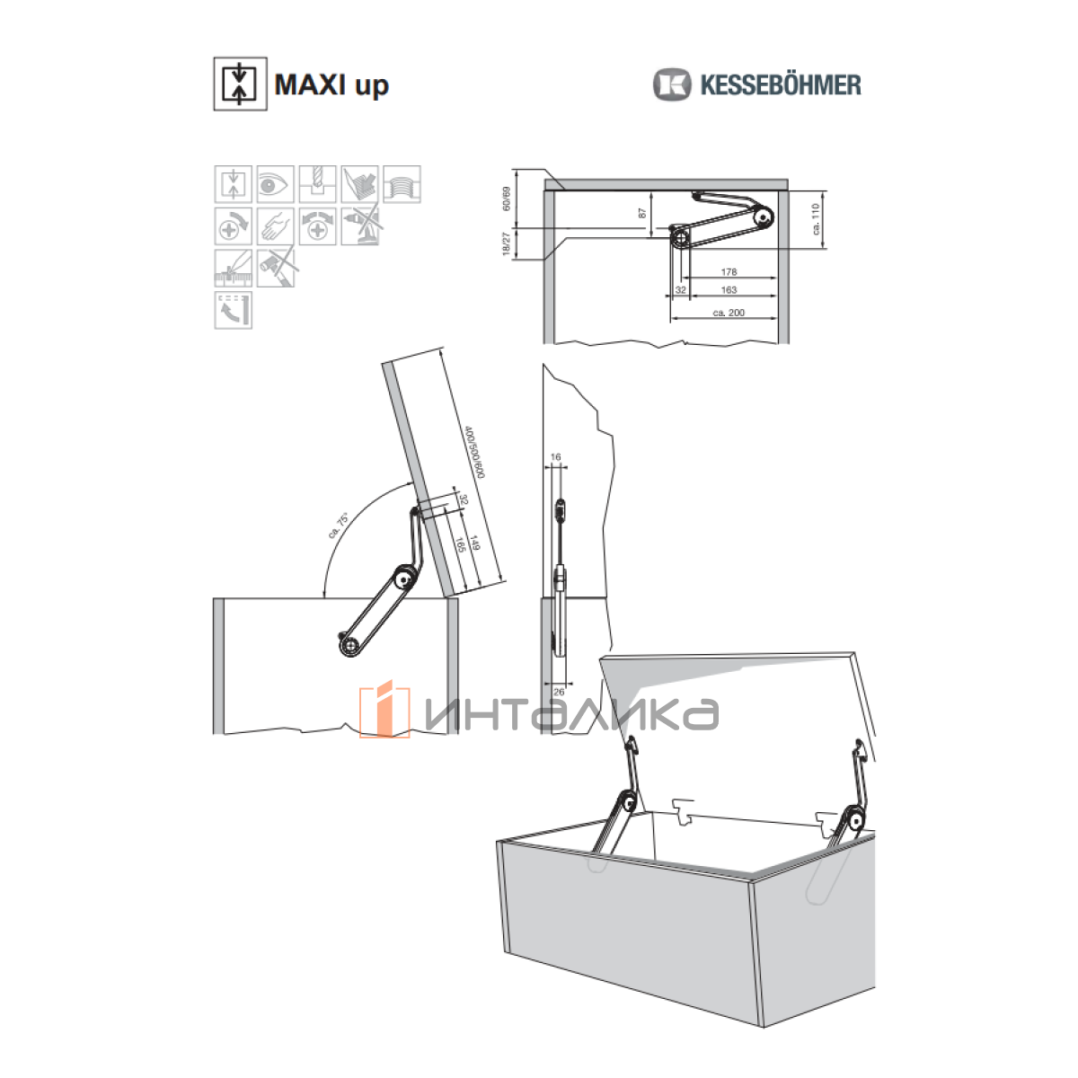 Комплект откидного подъемного механизма KESSEBOHMER Maxi Up Soft, тип H, с двумя силовыми механизмами, KHKXMUP21-2NI
