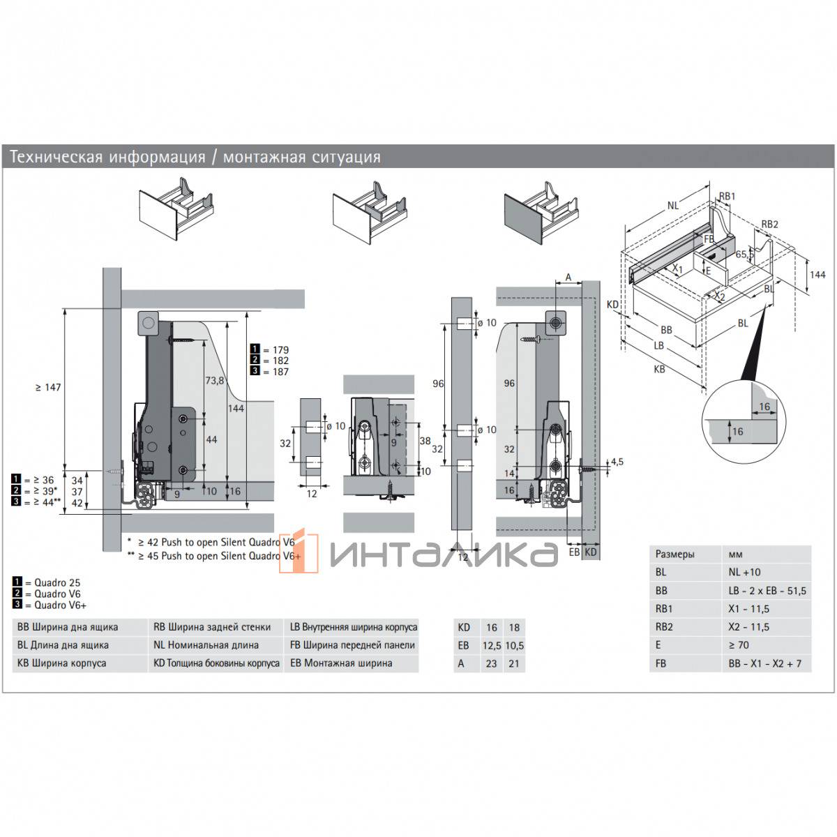Минимальная глубина корпуса для установки ящика составляет +15 мм к номинальной длине ящика