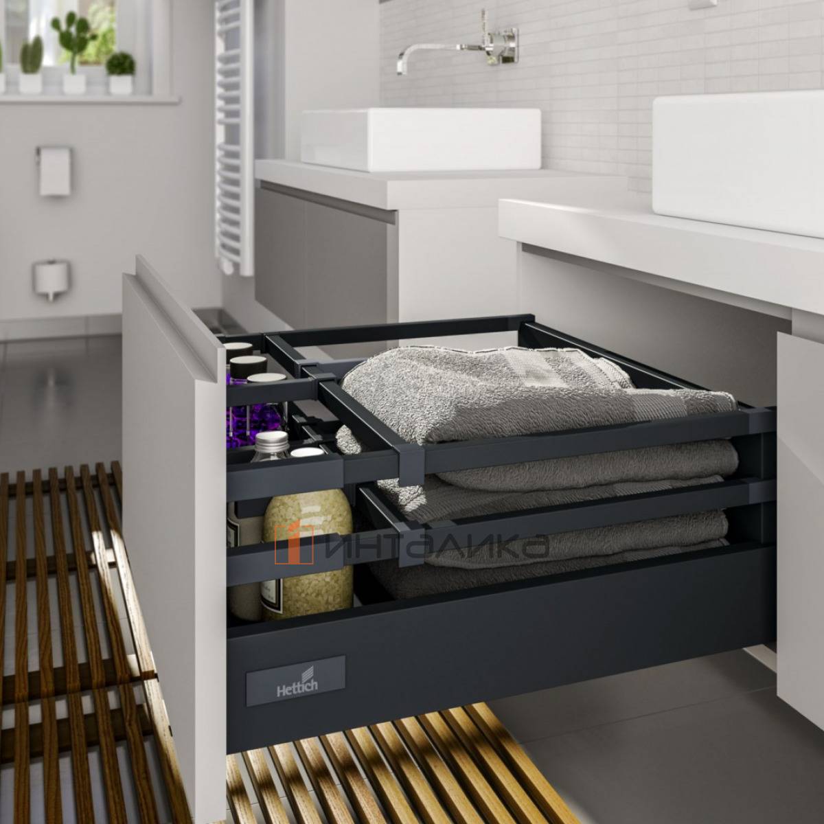 Фасадный ящик с двойным релингом HETTICH InnoTech Atira Quadro V6 Push to Open Silent полное выдвижение, H176, NL350, G30, снаряжённый вес ящика 8-20 кг, антрацит, ITA2C35P2OSFP20A
