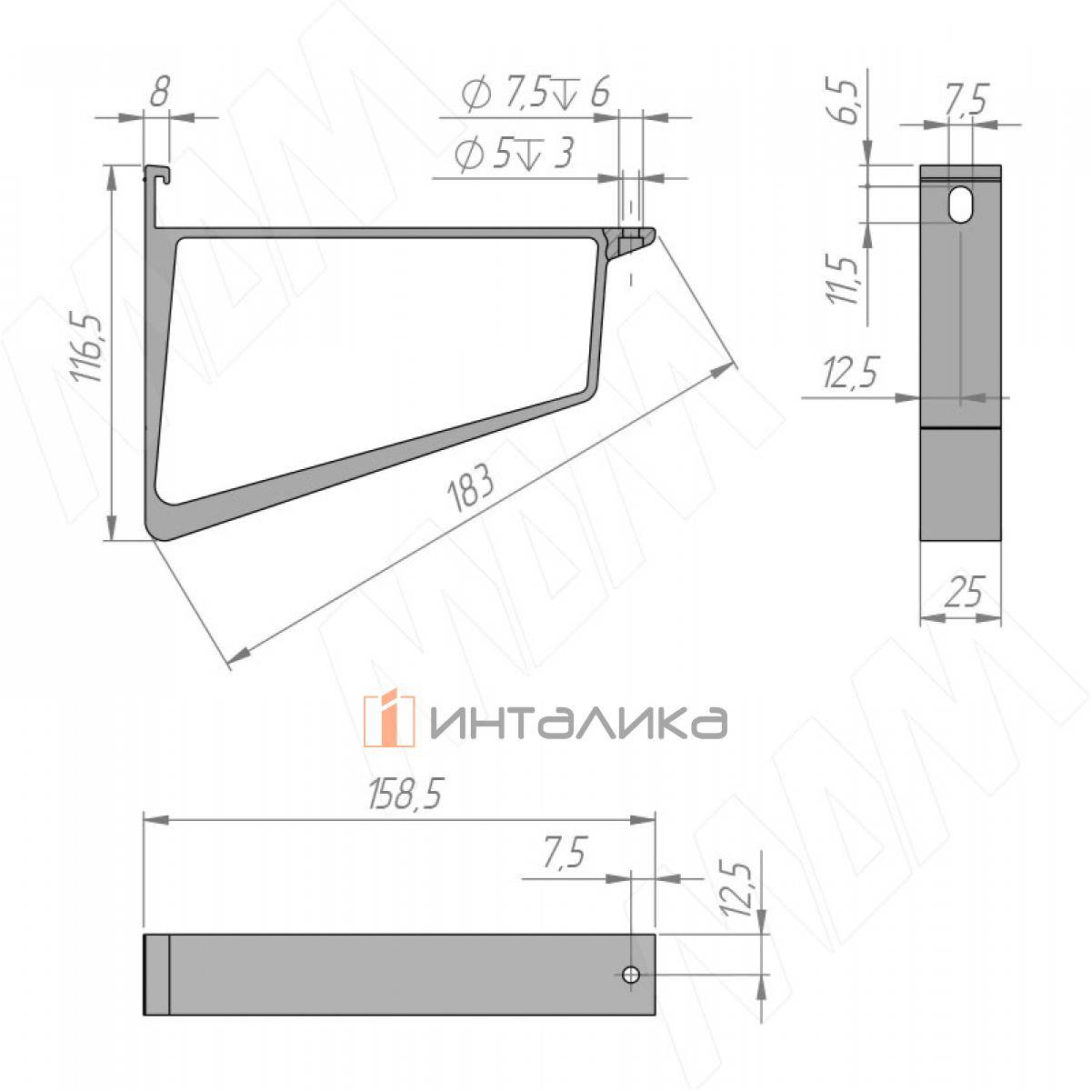 Комплектация: менсолодержатель — 1 шт., фиксирующая планка — 1 шт., крепёж для полки: саморез 3,5×25 мм — 1 шт., саморез 3,5×16 мм — 1 шт.