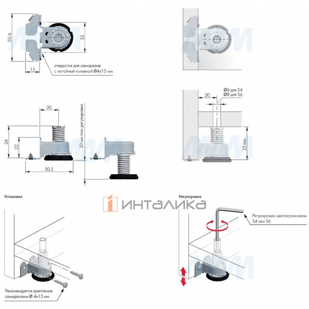 Применение: обновлённый вариант опоры INTEGRATO, предназначенной для компенсации неровности пола и выравнивания высоты тяжелых гардеробов, шкафов и корпусной мебели с цокольной конструкцией