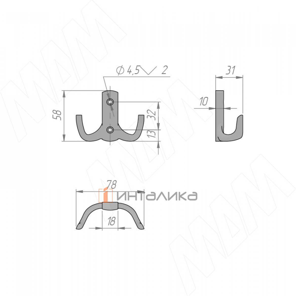 Крючок двухрожковый хром матовый (HK.18.SC), HK.18.SC