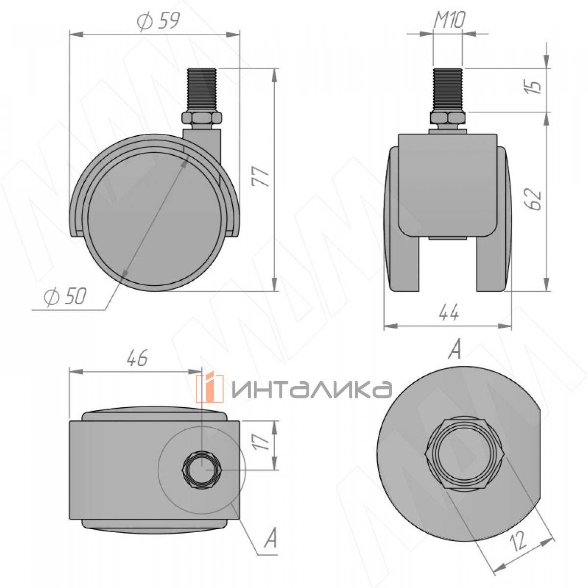 Опора двухколесная с винтом M10, D50 мм, без стопора, серая (OK-50/2/K/GR), OK-50/2/K/GR