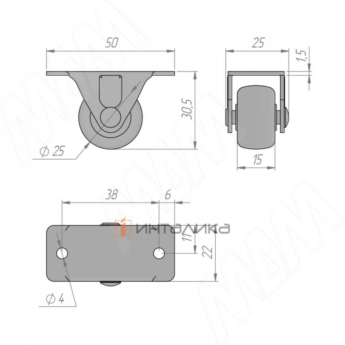 Опора колесная, прямоходная, высота 30 мм (KP-30), KP-30