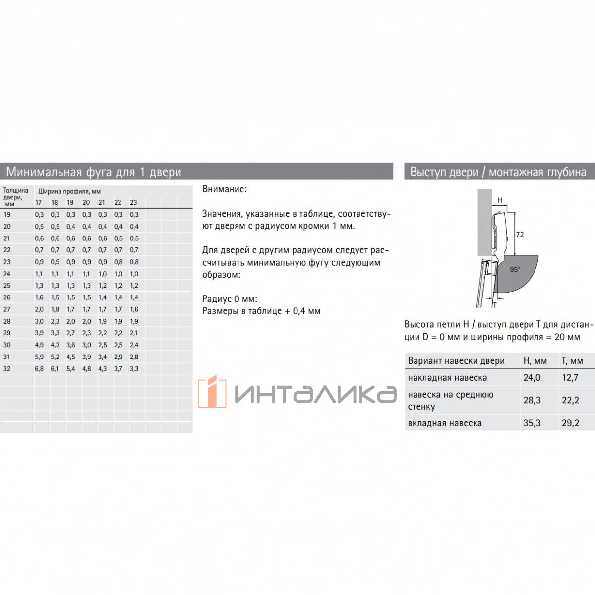 Петля HETTICH Sensys 8631i (B -4) 95°, для алюминиевых рам 23.5 мм, для толстых дверей до 32 мм, вкладная, с доводчиком, с пружиной, никель, 9091217