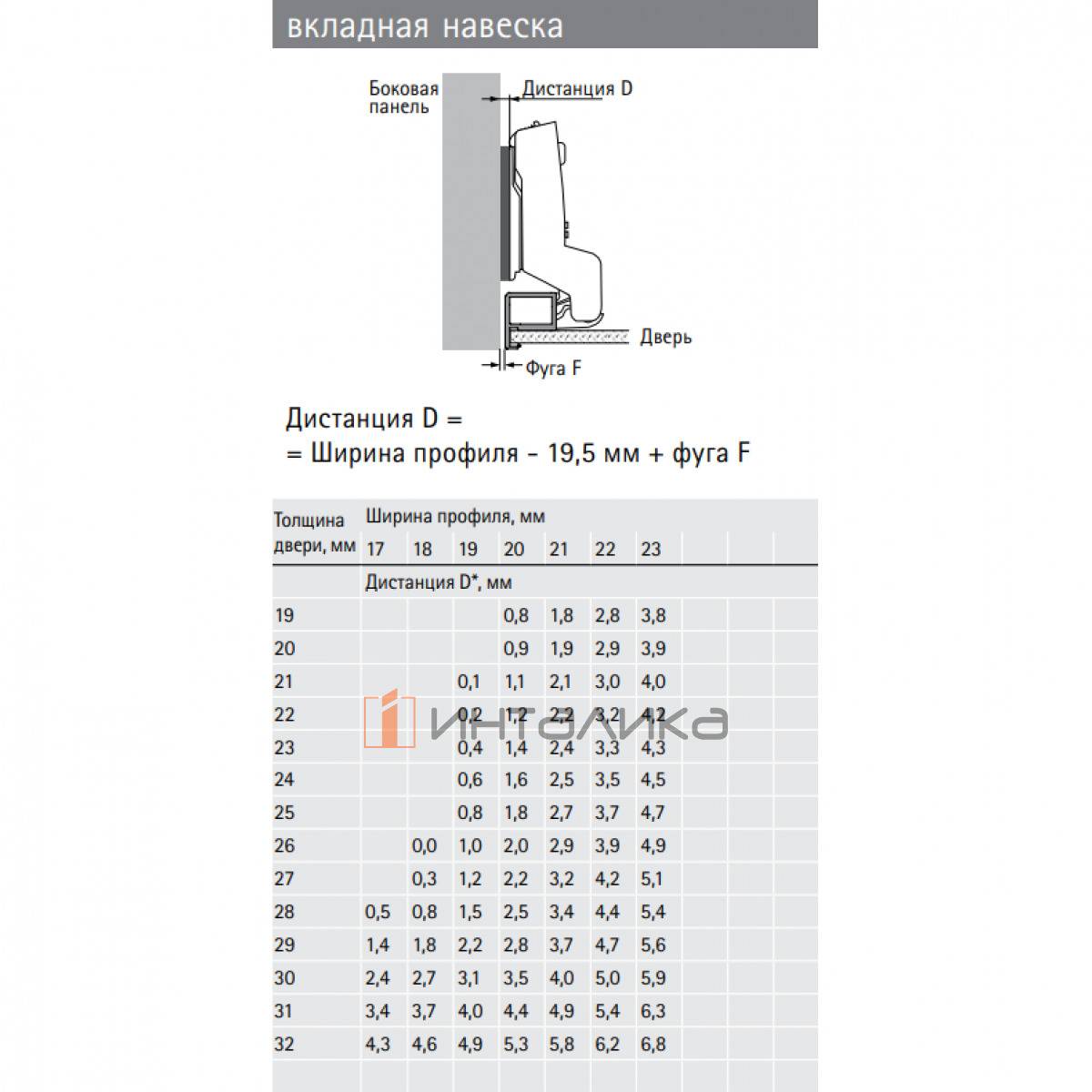 Применяется для открывания мебельных фасадов толщиной 19 - 32 мм, с шириной с алюминиевой рамы до 23.5 мм