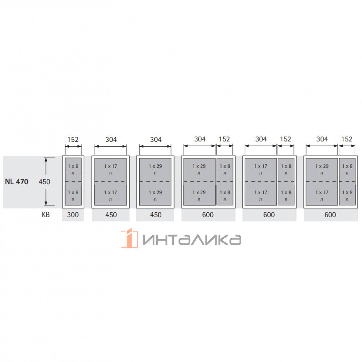 Набор HETTICH INNOTECH PULL P2O на 4 контейнера V29/8, NL470, KB600, H560, серебристый, PULIA60P2O470G02