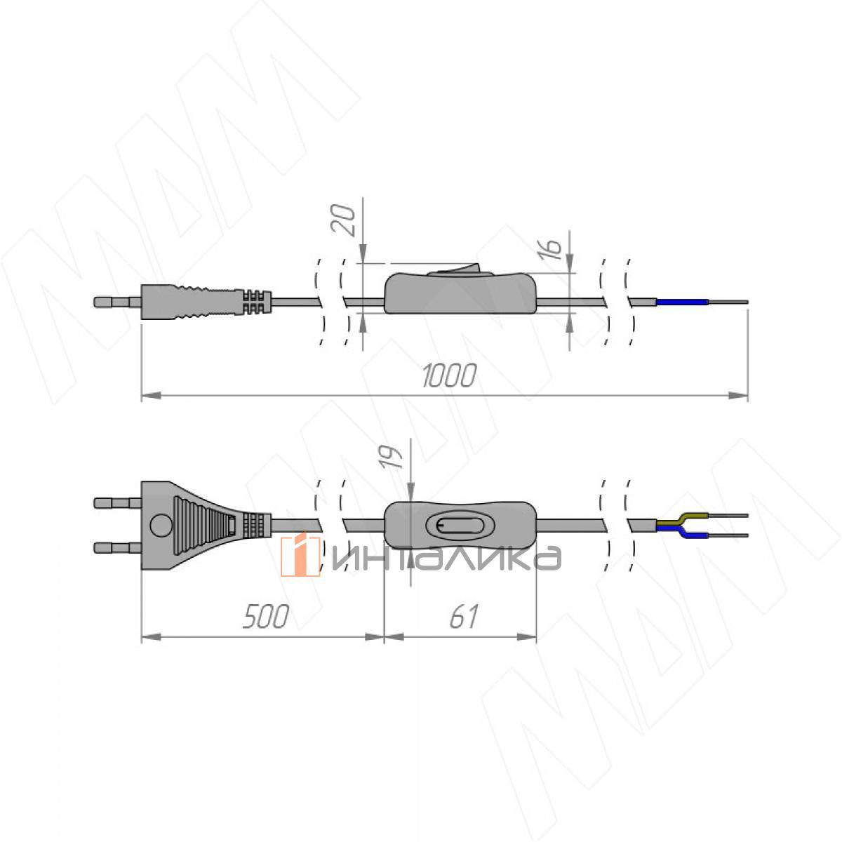 Дополнительная информация: на одном конце шнура — вилка, на другом — оголенные провода, которые могут быть закреплены в клеммную колодку, на вход блока питания или в разъёмы на светильнике