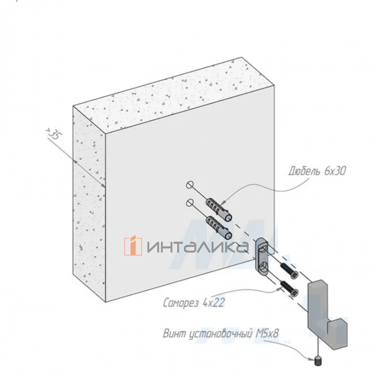 Комплектация: крючок, саморез 4×22 мм — 2 шт., дюбель 6×30 мм — 2 шт., винт установочный М5×8 мм — 1 шт., площадка (крепление к стене) — 1 шт., ключ шестигранный S2,5 мм — 1 шт.