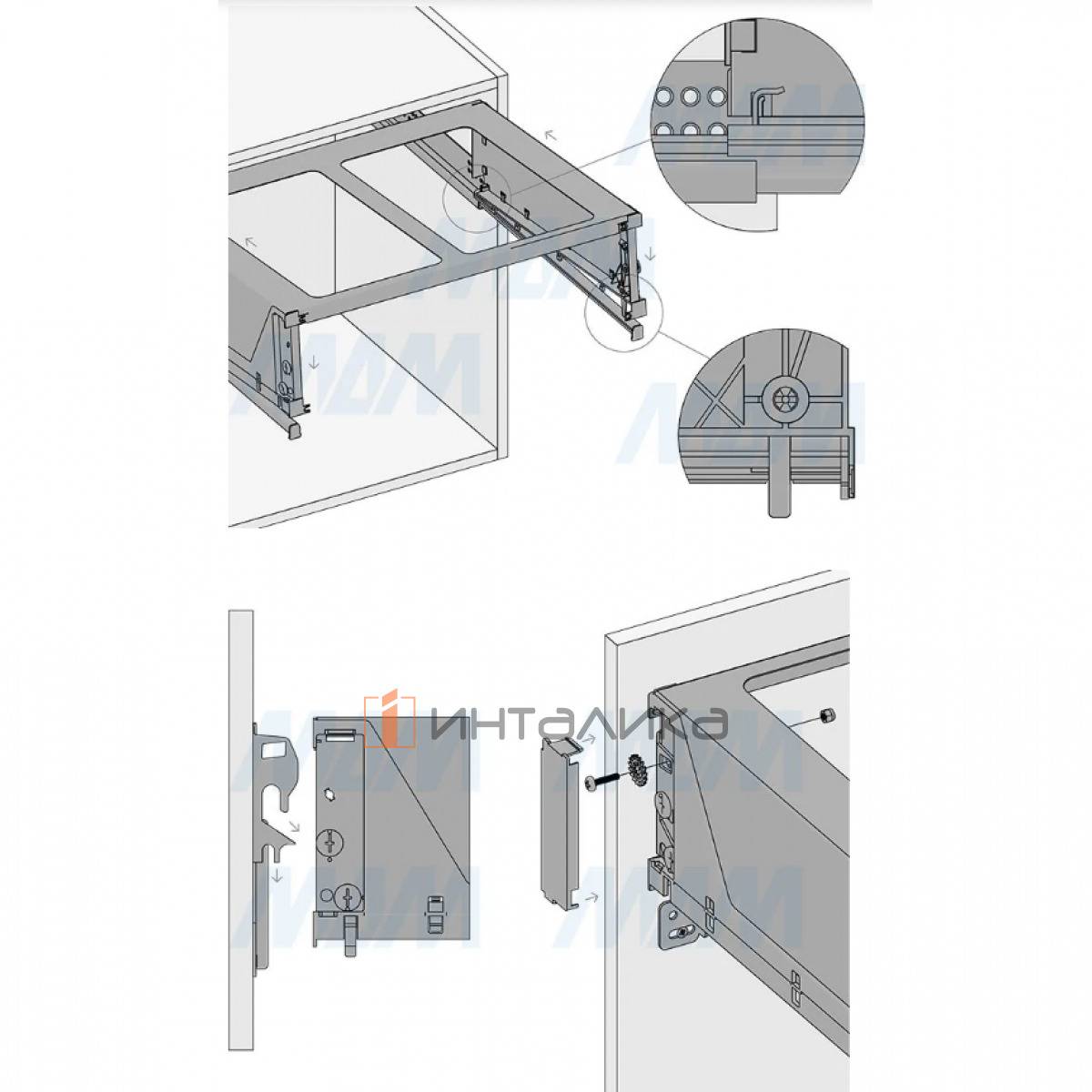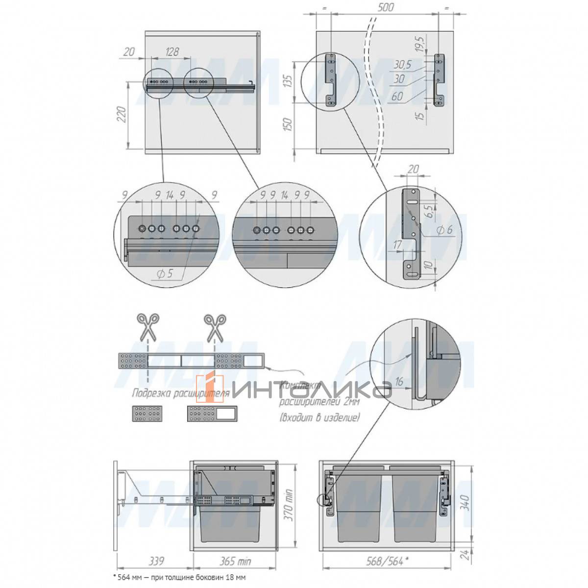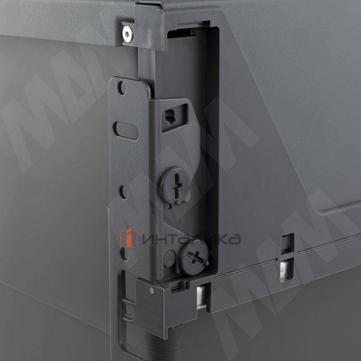 Комплектация: рама — 1 шт., крепление фасада — 2 шт., заглушка — 2 шт., направляющие — 1 компл., адаптер направляющих — 2 шт., ведро — 2 шт., ручка — 2 компл., крышка — 2 шт., крепёж — 2 компл.