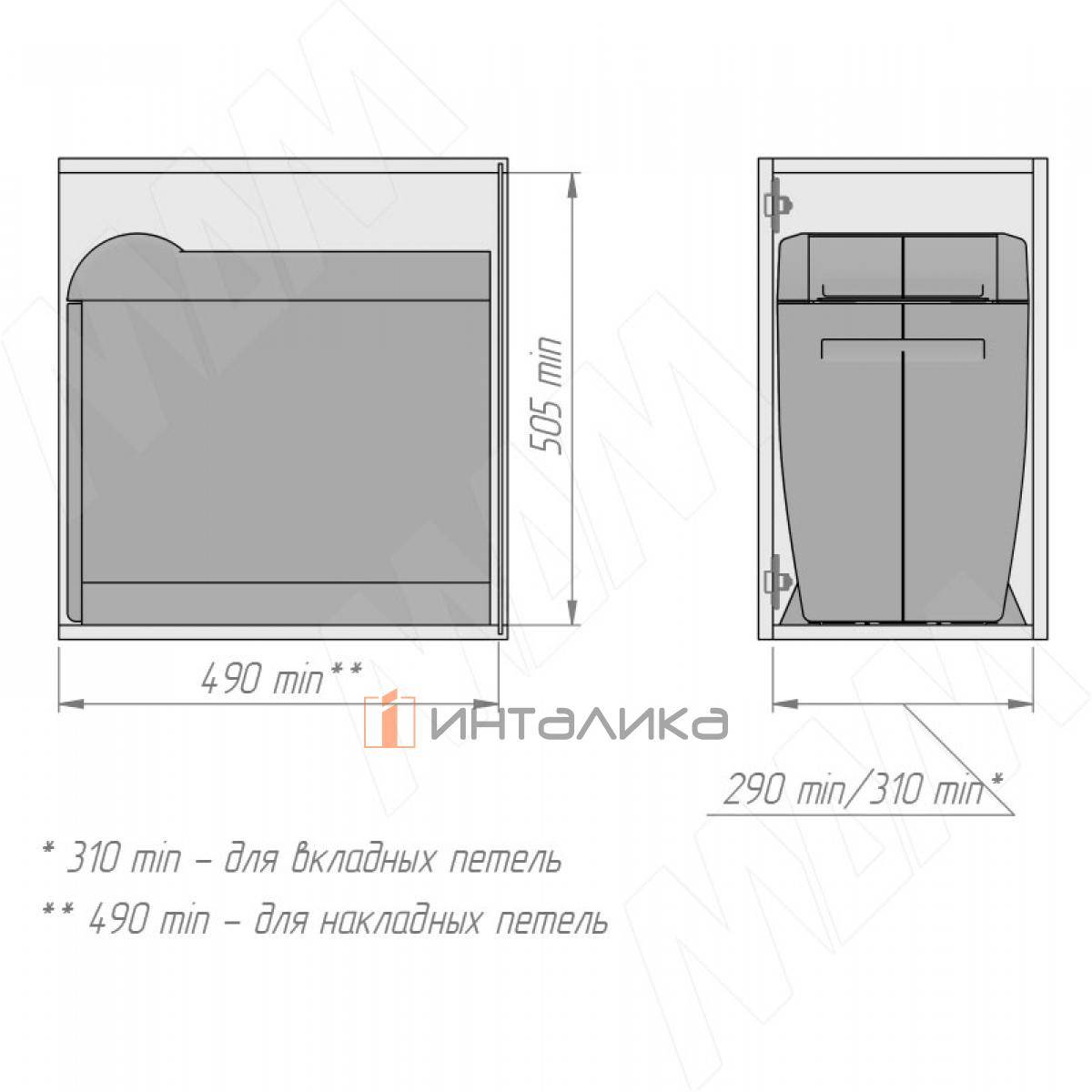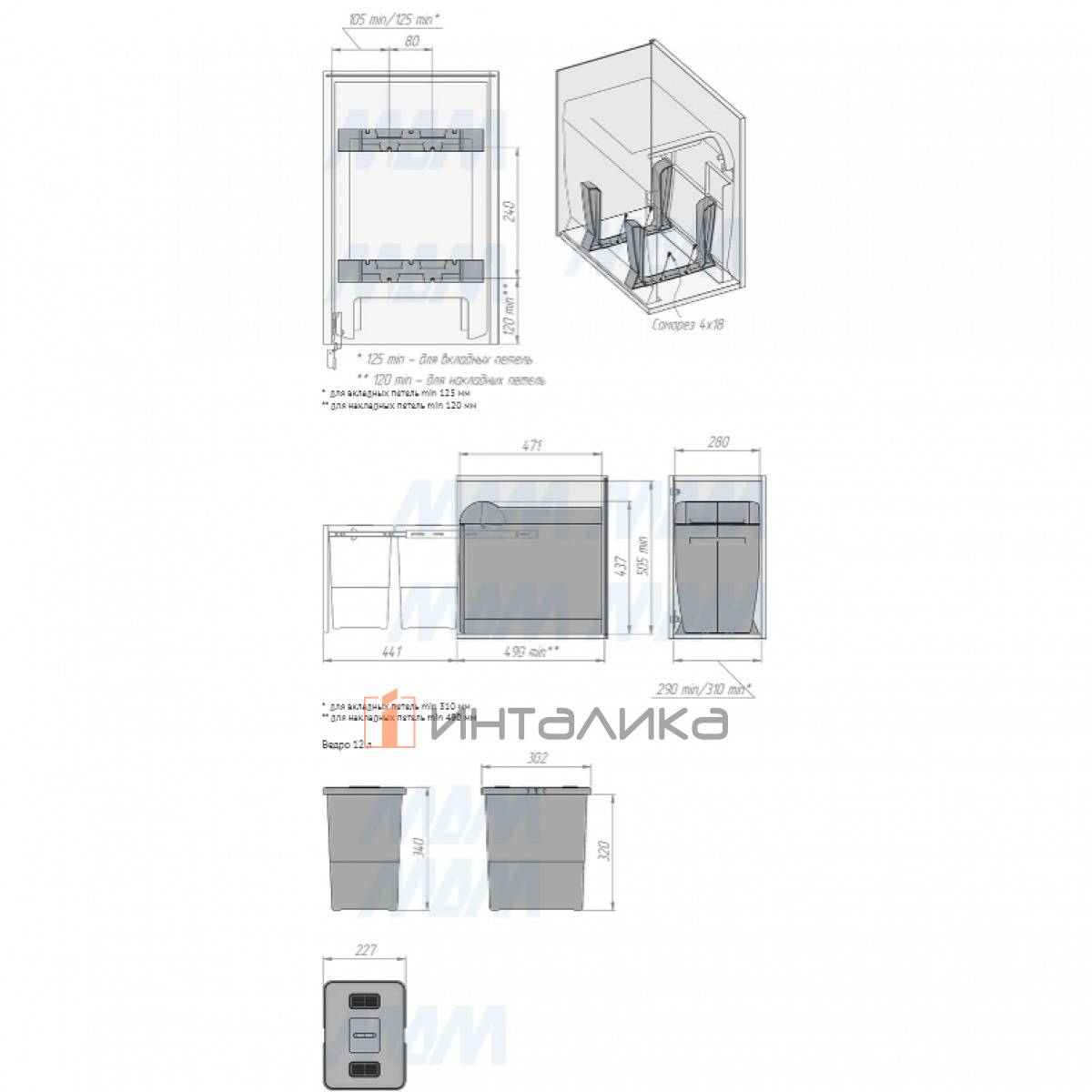 Комплектация: корпус с направляющими в сборе — 1 шт., ведро — 2 шт., ручки для ведра — 2 компл., крепёж — 1 компл.