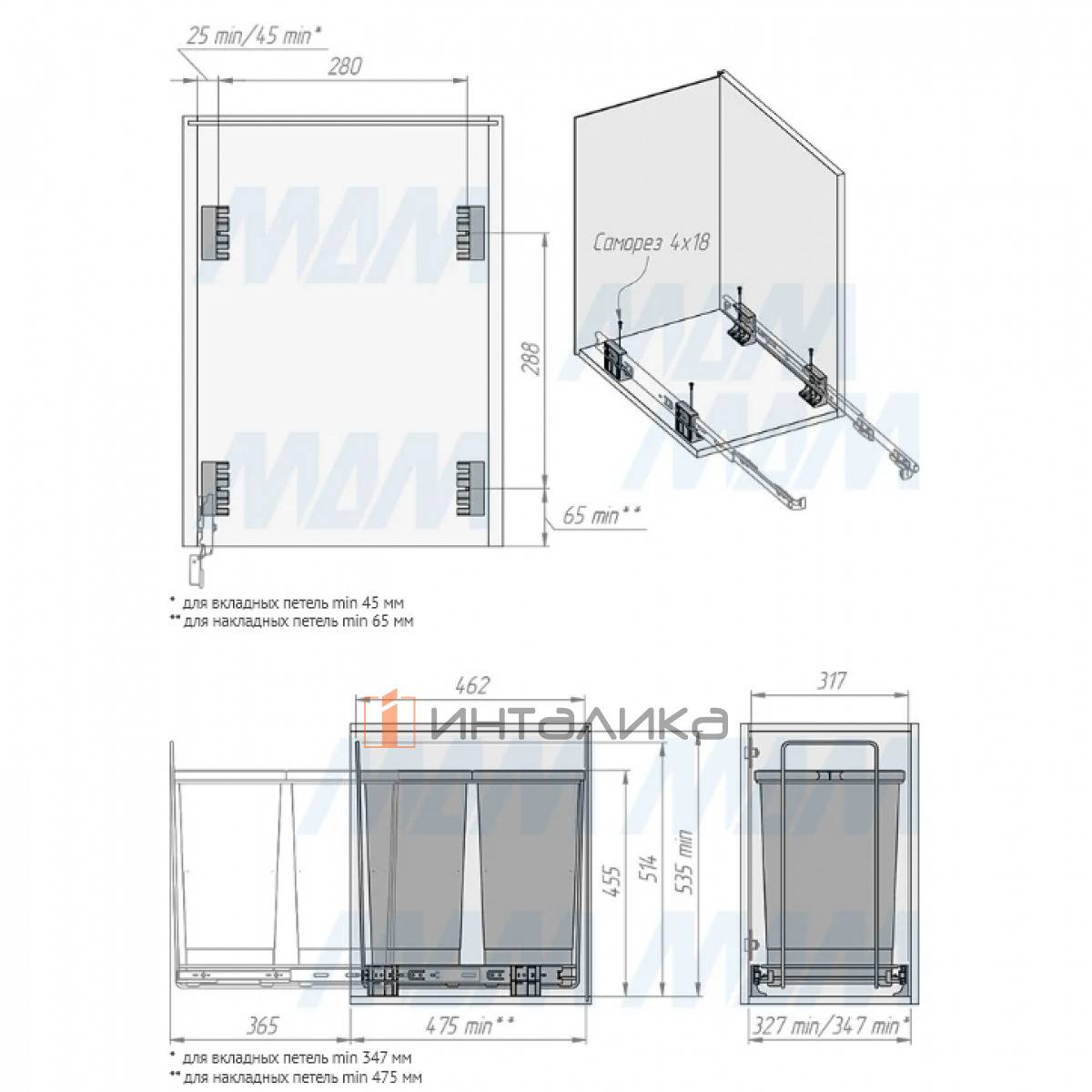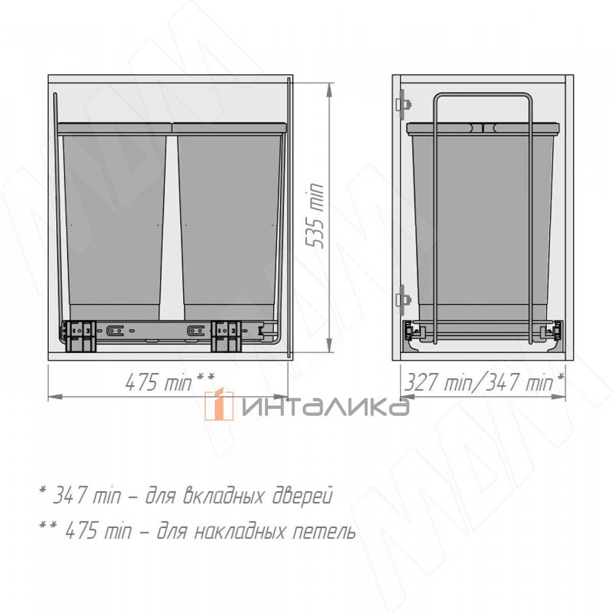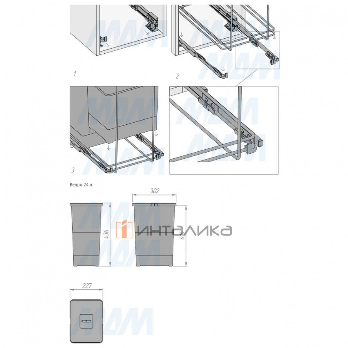 Комплектация: рама с направляющими — 1 шт., ведро — 2 шт., ручки для ведра — 2 компл., крышка для ведра — 2 шт., крепёж — 1 компл.