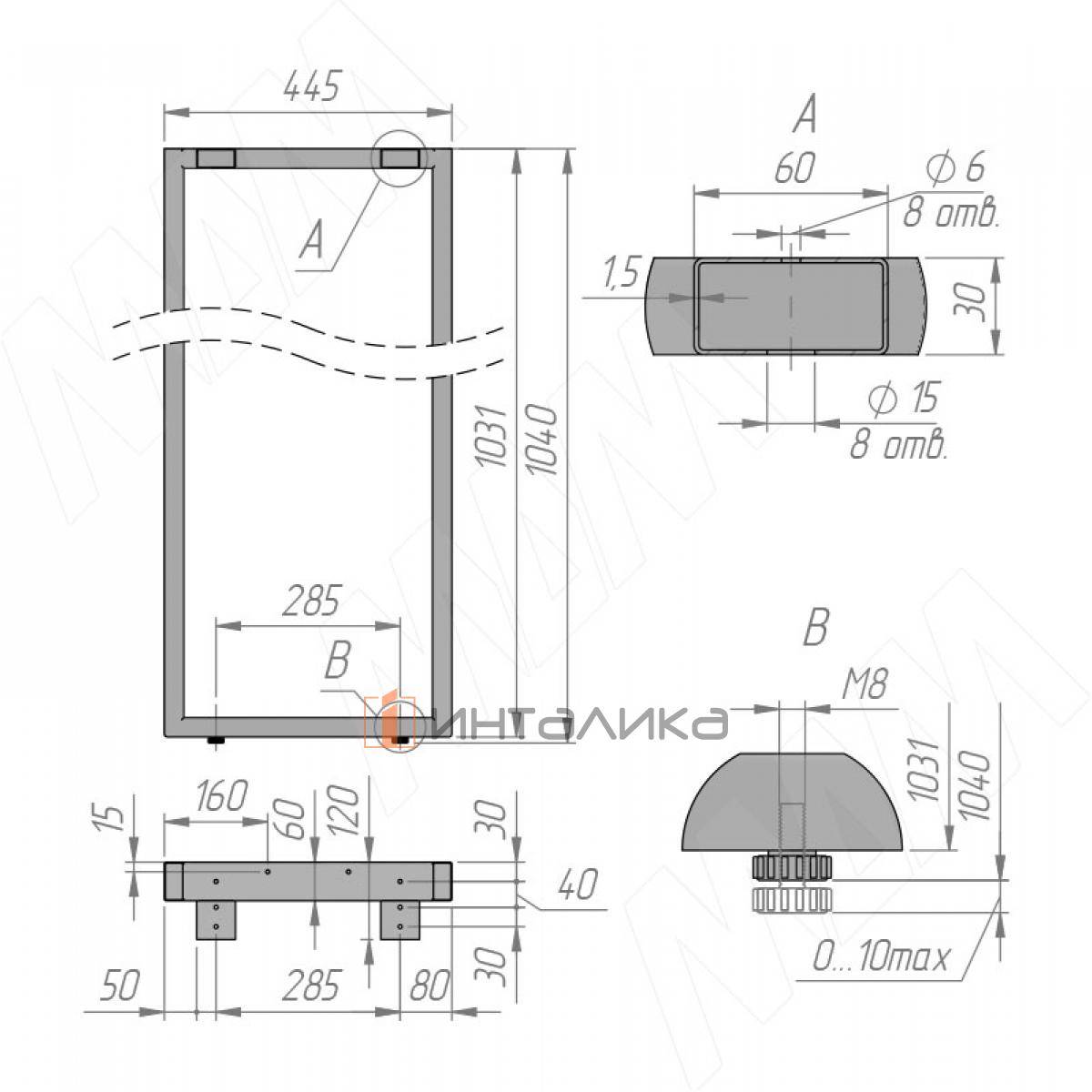 Пилар опора для стола П-образная, 60х30, 445xH1040 (+10 мм), хром матовый (RAL 9006, муар), П60X30/445X1040 CRM