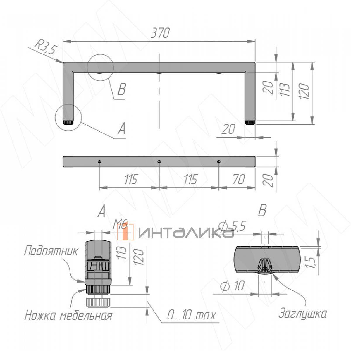 Комплектация: опора — 1 шт., заглушка D9–11 мм — 3 шт., подпятник 20×20 мм с резьбой M6 — 2 шт., ножка резьбовая — 2 шт.