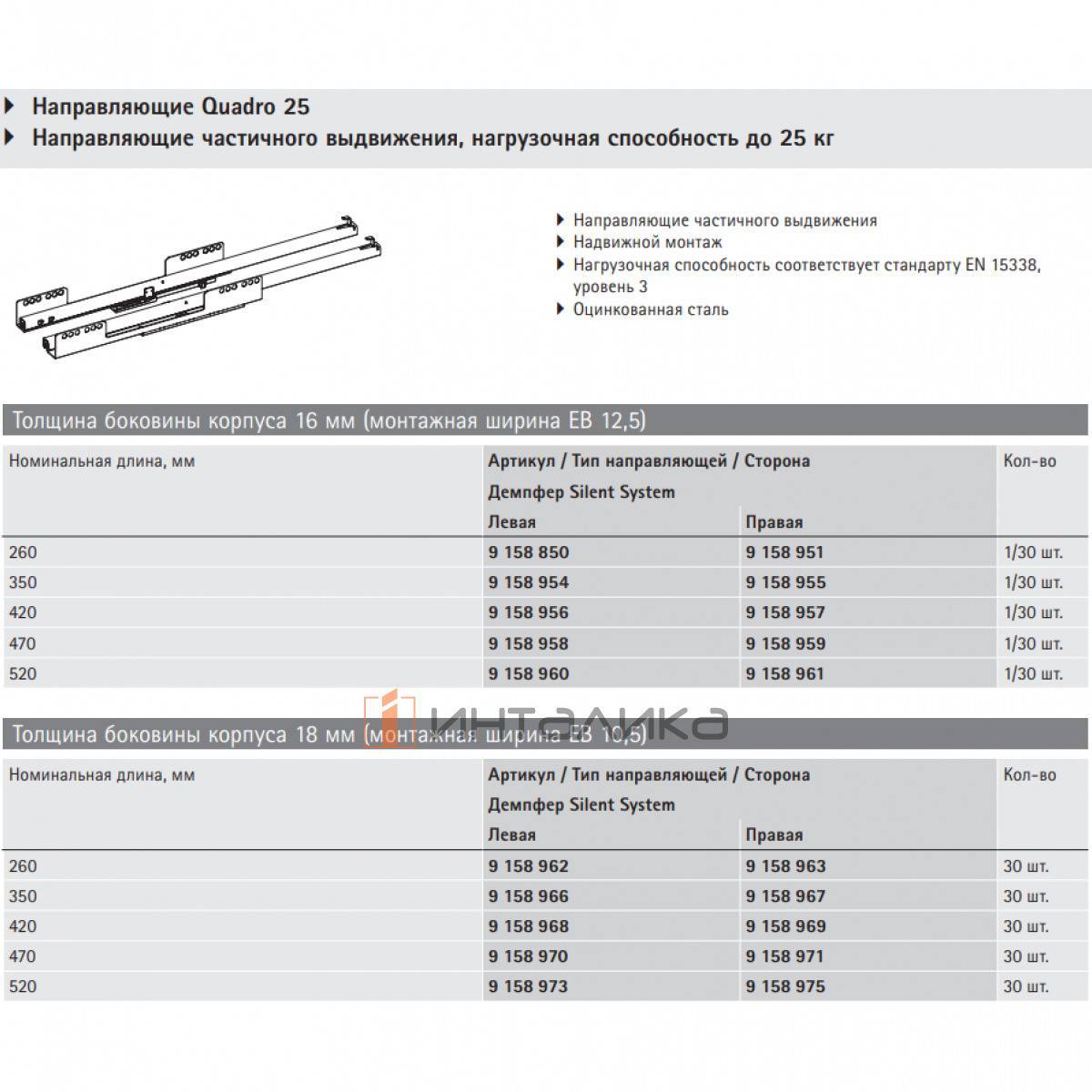 Направляющая HETTICH Quadro 25, NL550, P2O, частичное выдвижение, G25, EB20, правая, под замки