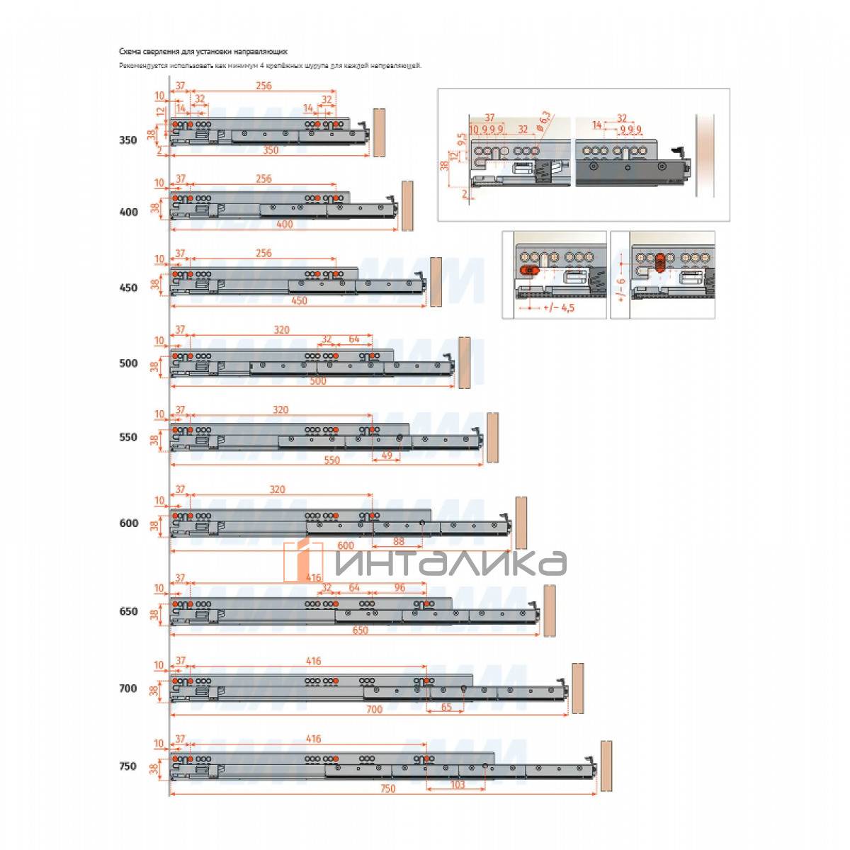 Комплект направляющих скрытого монтажа F70 SMOVE, полное выдвижение, 350мм, с фиксаторами, G7E6S350XXB-S