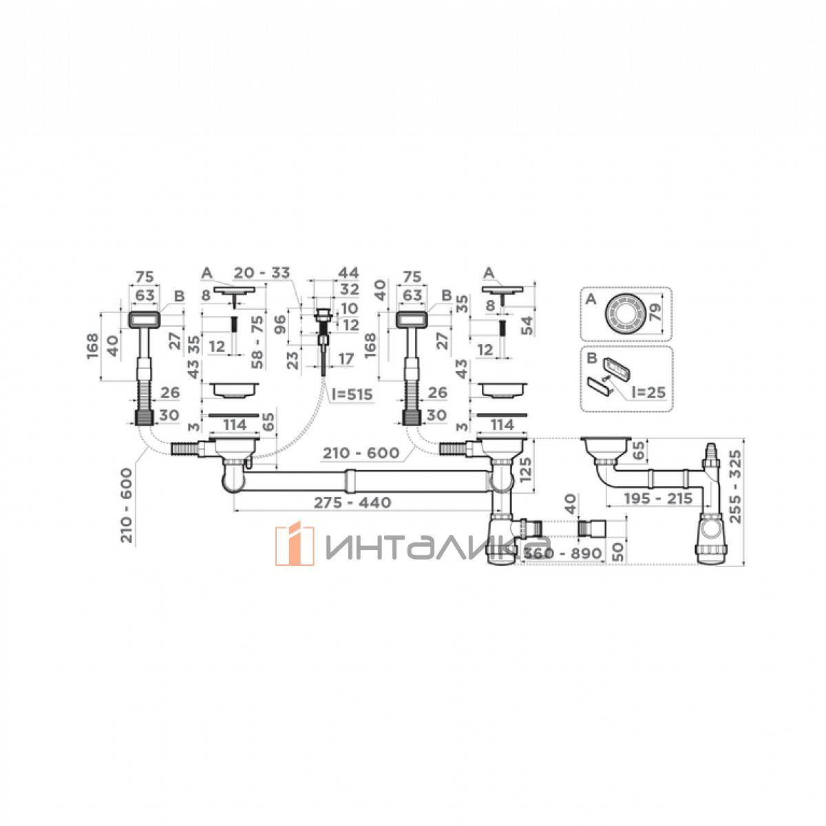 Арматура с клапаном-автоматом для двухчашевых моек с прямоугольными переливами