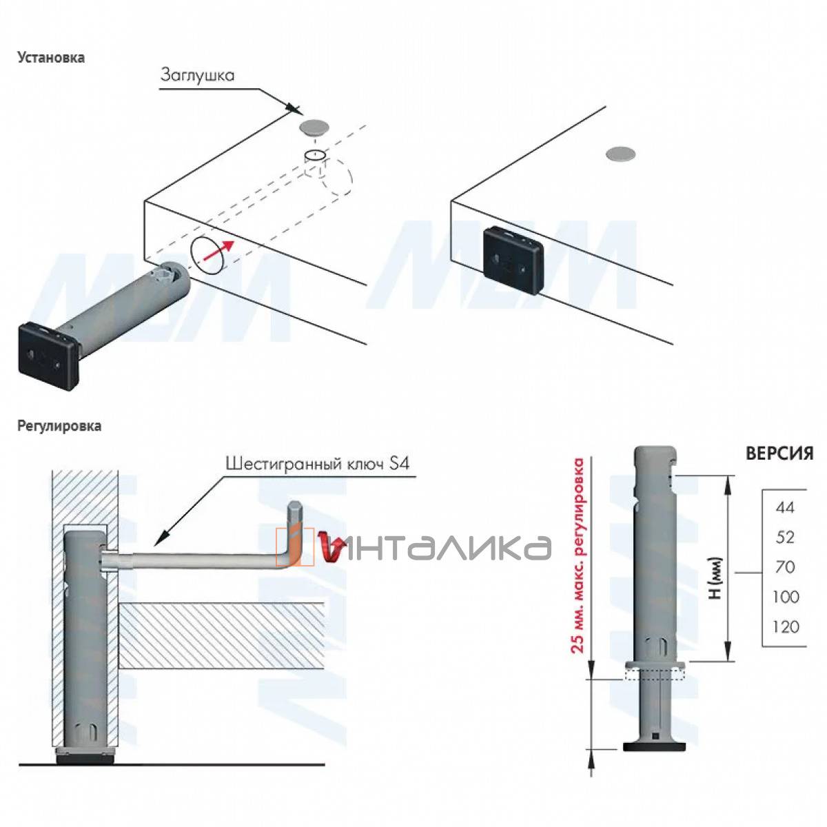 • регулировка 25 мм по высоте осуществляется шестигранным ключом S4 мм через небольшое отверстие с внутренней стороны боковины;