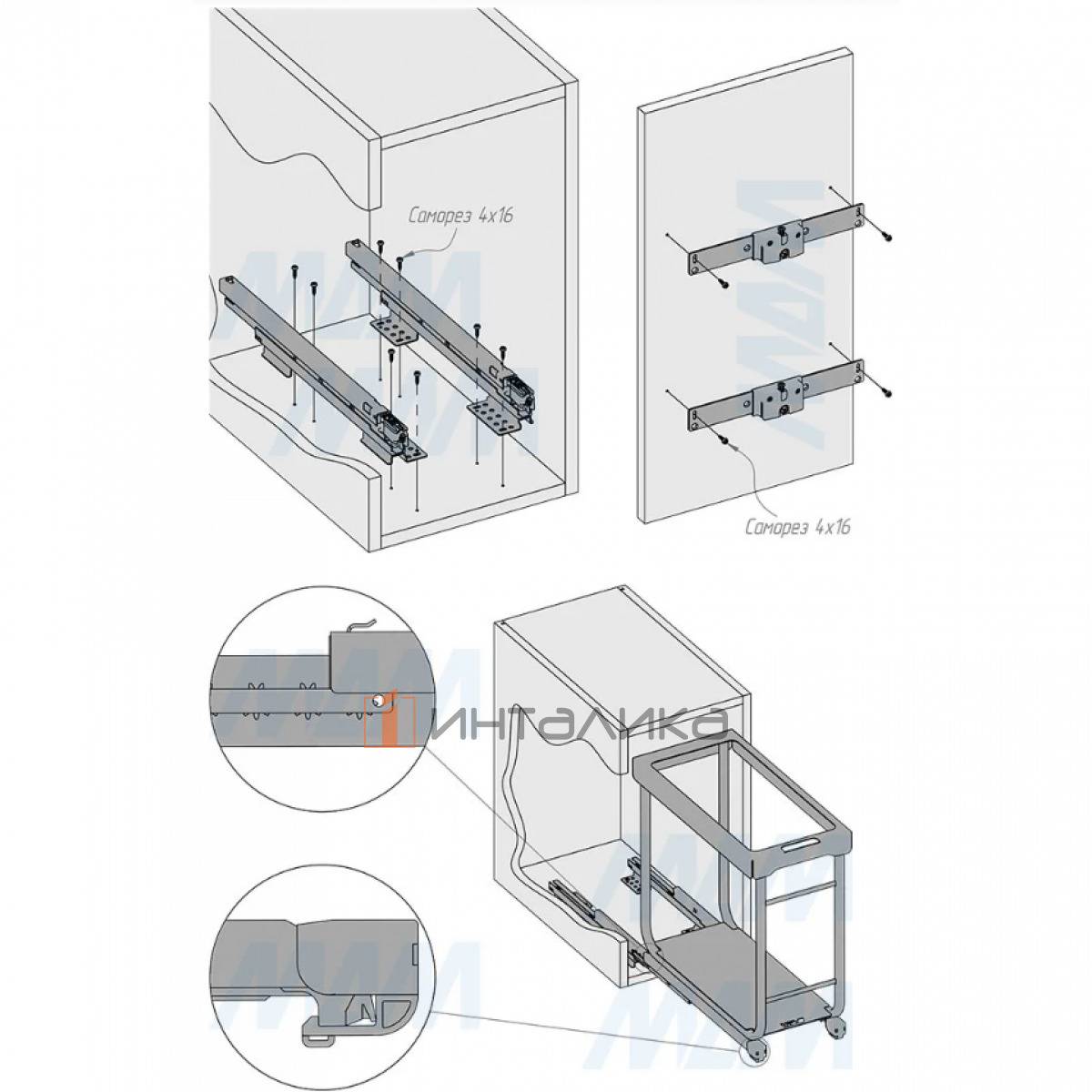 Комплектация: комплект рамы — 1 шт., крепление фасада — 2 шт., ведро — 1 шт., ручка — 1 компл., направляющие — 1 компл.