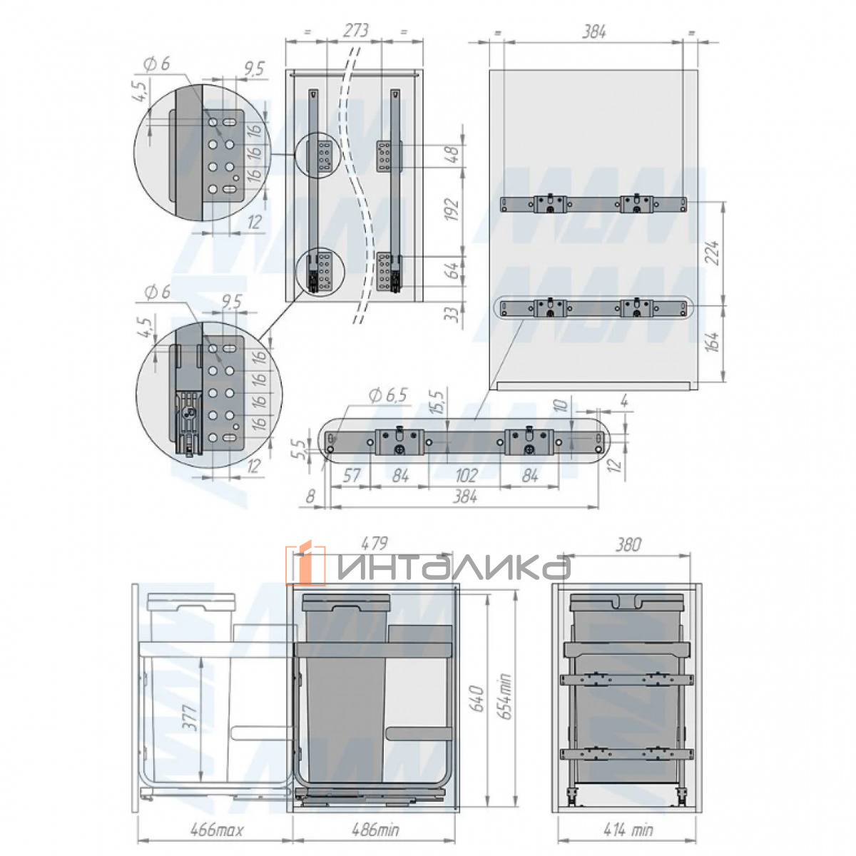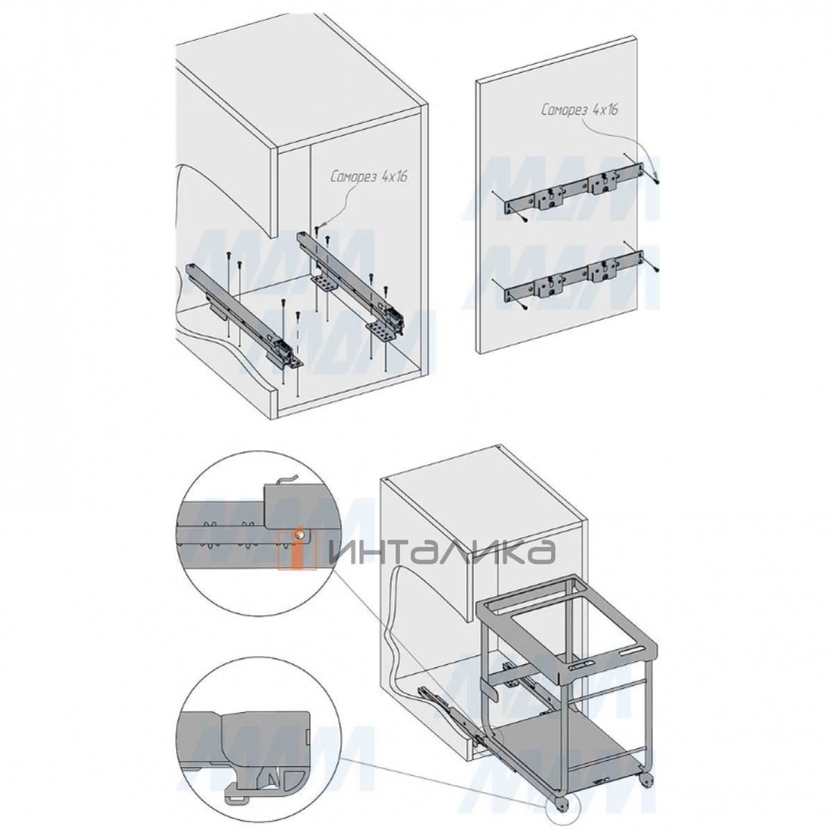 Комплектация: комплект рамы — 1 шт., крепление фасада — 2 шт., ведро — 1 шт., ручка — 1 компл., крышка-полка — 1 компл., направляющие — 1 компл., съёмный лоток-органайзер — 1 шт.