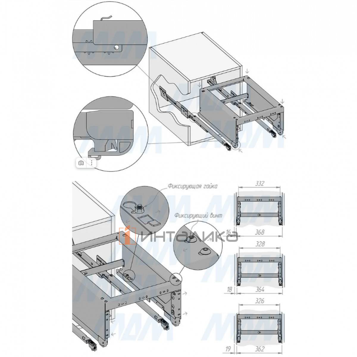Комплектация: комплект рамы — 1 шт., крепление фасада — 2 шт., ведро — 2 шт., ручка — 2 компл., направляющие — 1 компл., крепёж — 1 компл.