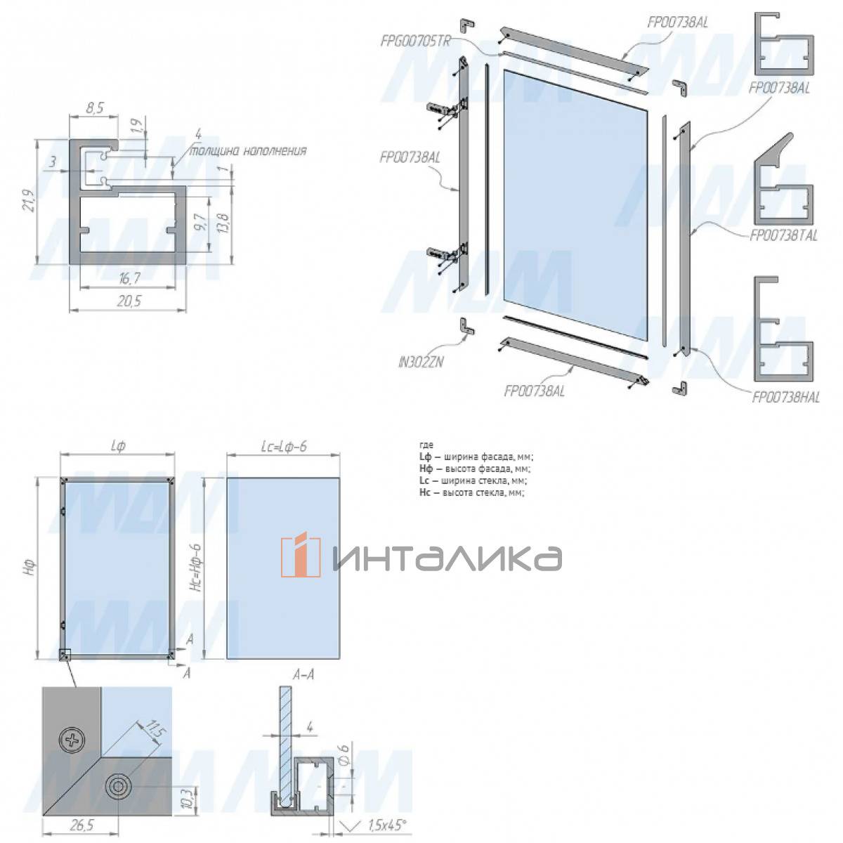 Профиль используется с четырехшарнирными петлями и уголками для узкого рамочного профиля.