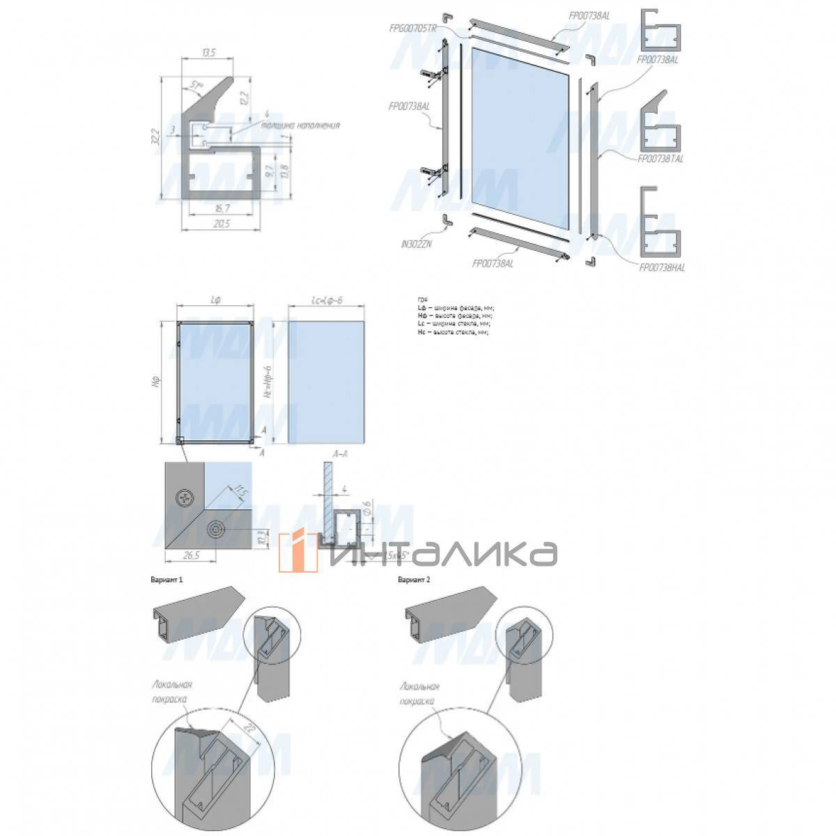 Профиль используется с четырехшарнирными петлями и уголками для узкого рамочного профиля.