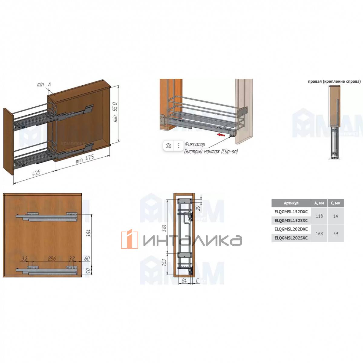 ROUND Двухуровневая корзина 150 мм (бутылочница), боковым креплением прав., направляющие Nova Pro, ELQGMSL152DXC