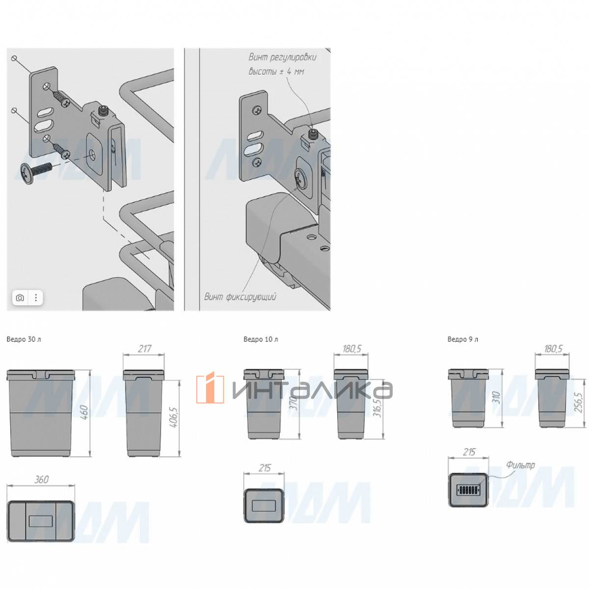 Комплектация: комплект рамы — 1 шт., крепление фасада — 4 шт., ведро — 3 шт., ручка — 3 компл., крышка — 3 шт., направляющие — 1 компл.