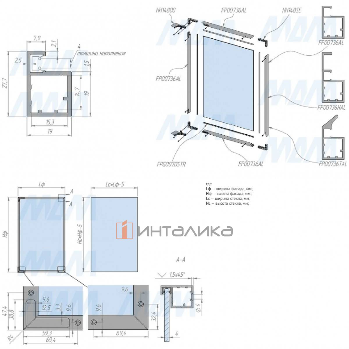 Профиль используется со скрытыми петлями SECRET и специальными сборочными уголками. Такое решение позволяет получить готовое изделие с практически незаметной для пользователя фурнитурой.