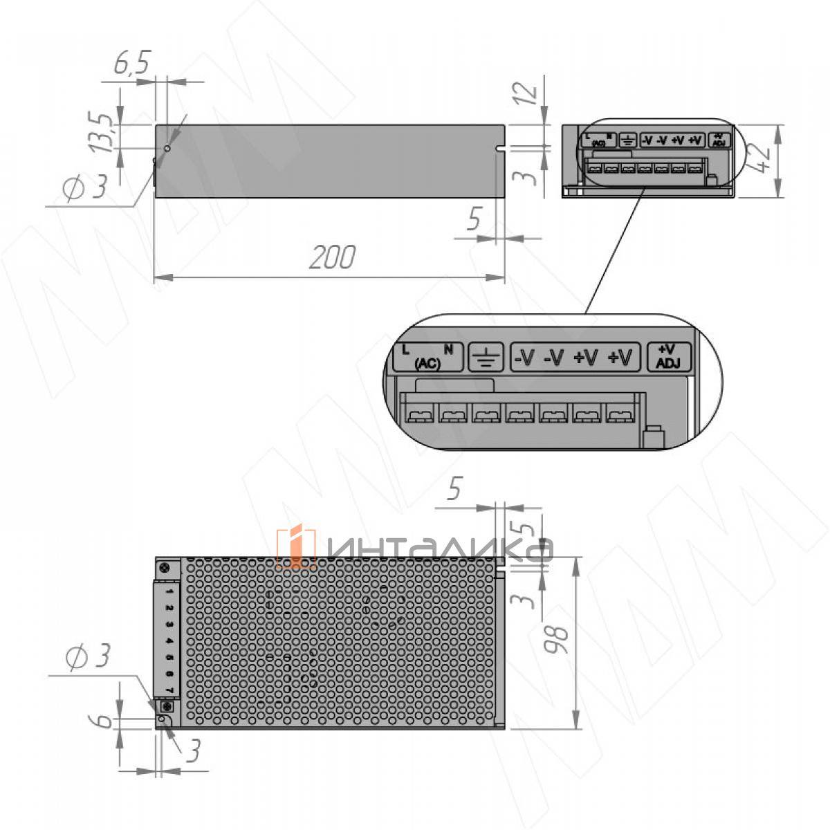 Блок питания преобразует первичное сетевое напряжение до постоянного выходного напряжения 12 В.