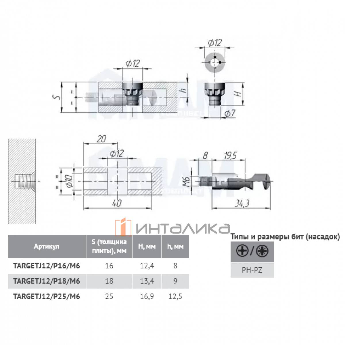 TARGET Стяжка винтовая J12 метрическая резьба М6, для плиты 16мм, TARGETJ12/P16/M6