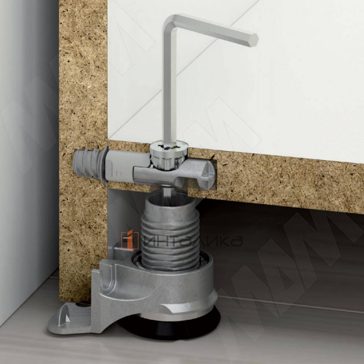 Применение: используется как стяжка с возможностью регулировки опоры (рекомендуется использовать опору INTEGRATO арт. 3010105000) шестигранным ключом 4 мм; возможно использование для соосного соединения для боковины 16 мм