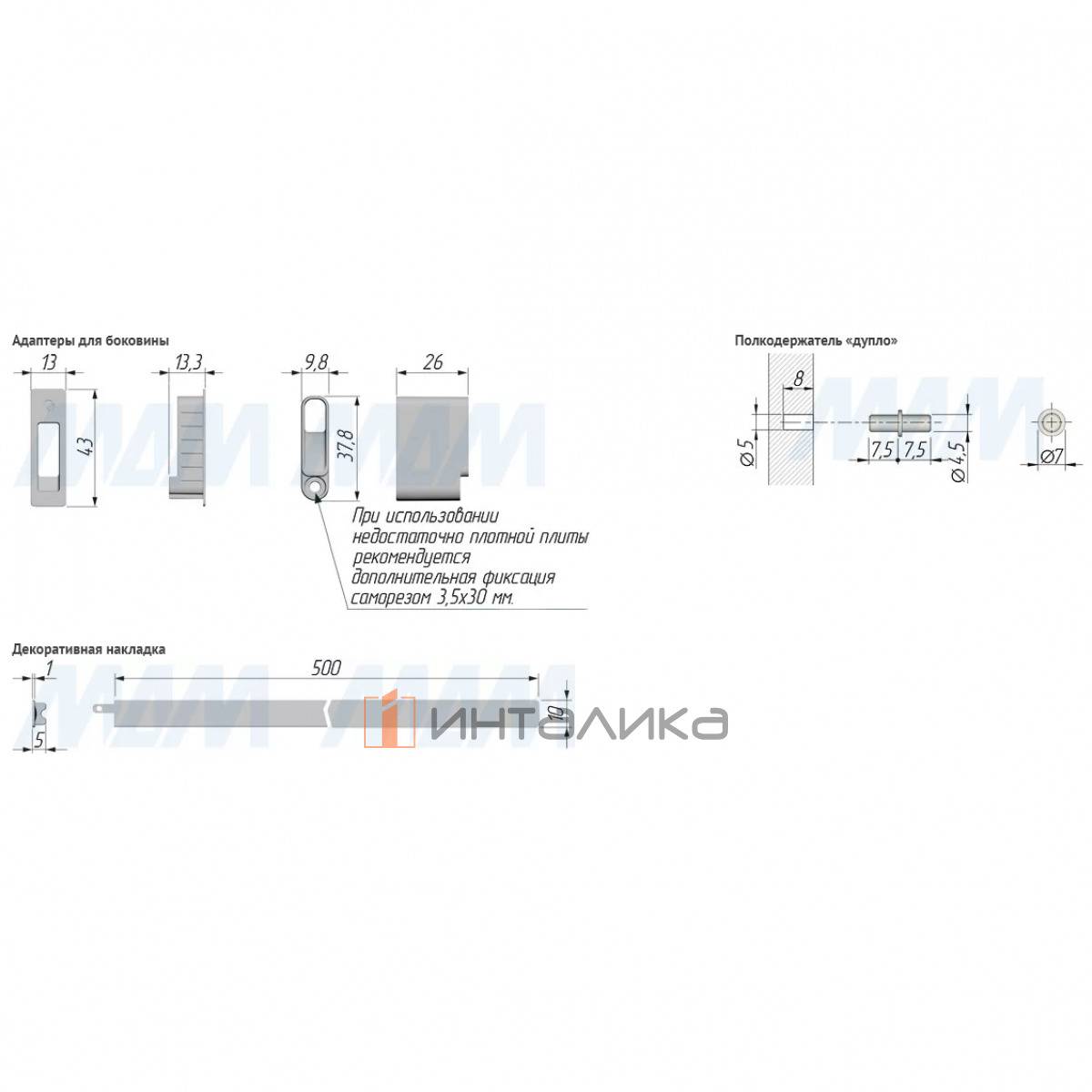 Комплектация: пластиковые адаптеры для боковины, полкодержатель «дупло» — 2 шт., декоративная накладка
