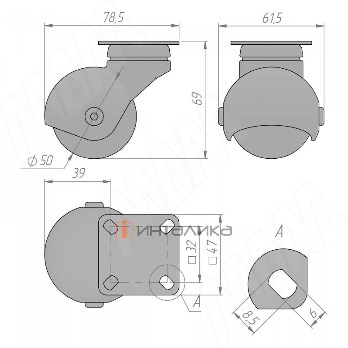 ORLANDO Опора колесная, прорезиненное колесо, D50 мм, без стопора, бронза, CST60