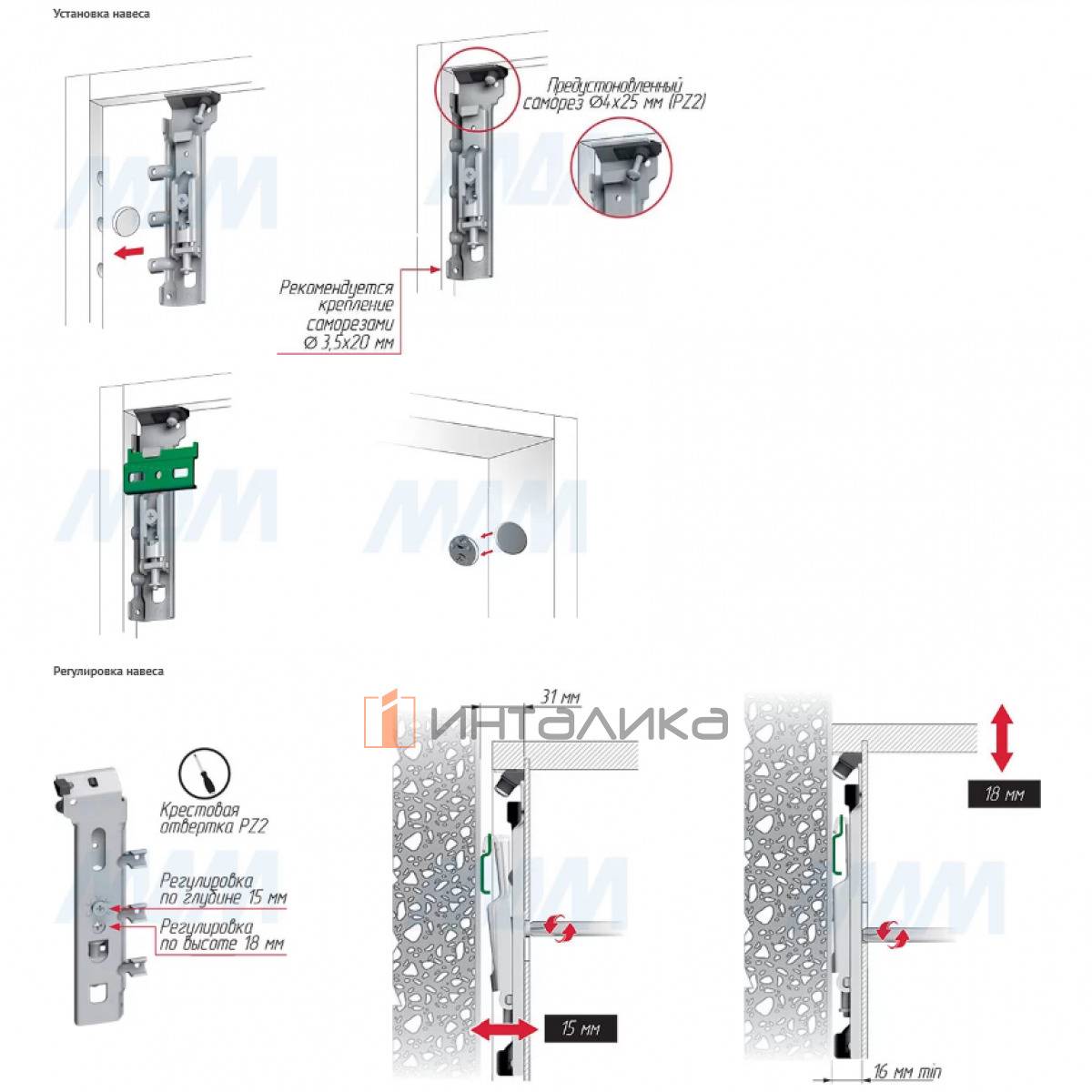 Регулировка: по высоте - 18 мм, по глубине - 15 мм (при регулировке навеса не использовать шуруповерт!)