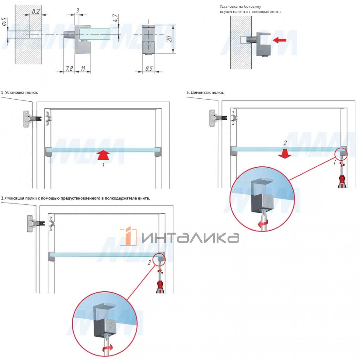 • для стеклянных полок толщиной 8 мм;