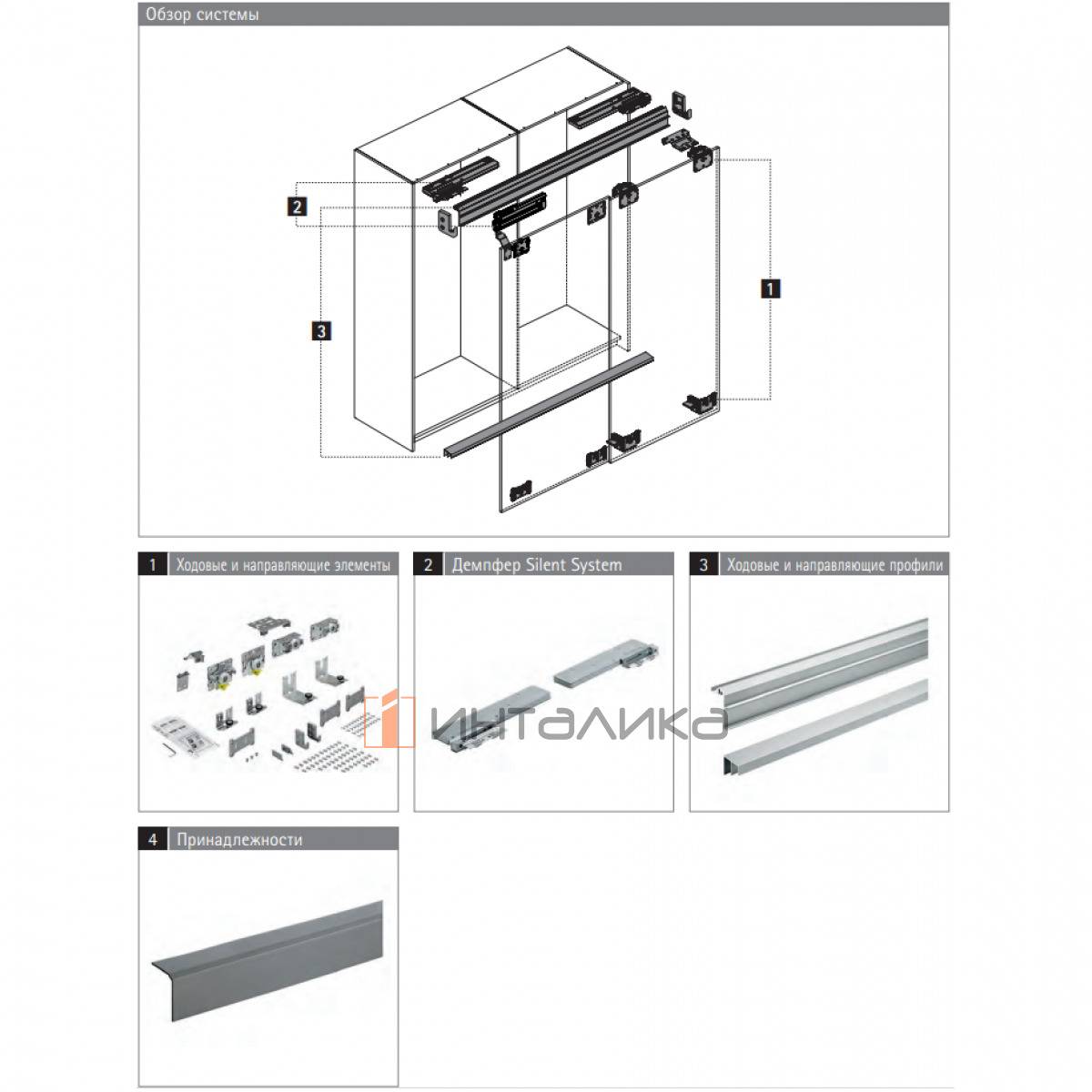Комплект фурнитуры HETTICH Top Line L содержит все необходимые ходовые и направляющие элементы, а также комплект крепежа для 2-х дверного шкафа