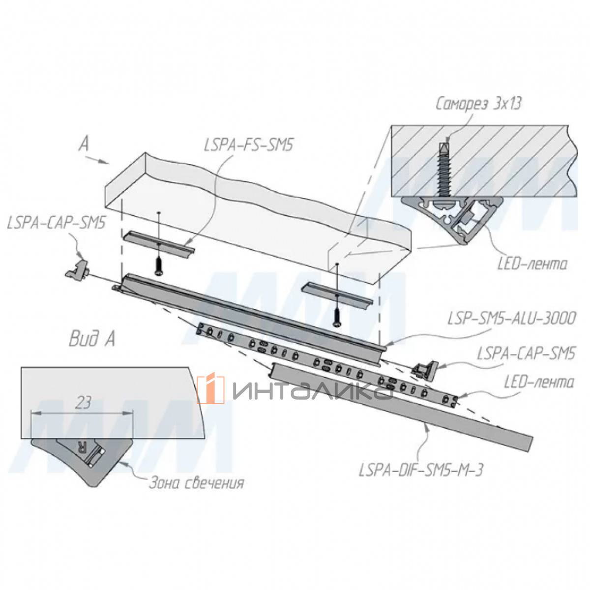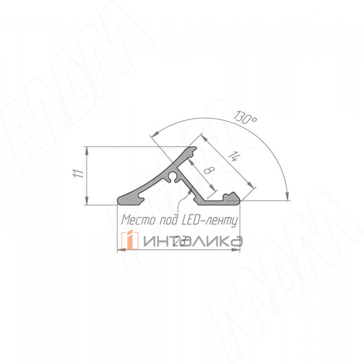 • поверхность профиля, на которой фиксируется светодиодная лента, наклонена, благодаря чему свет распространяется под углом;