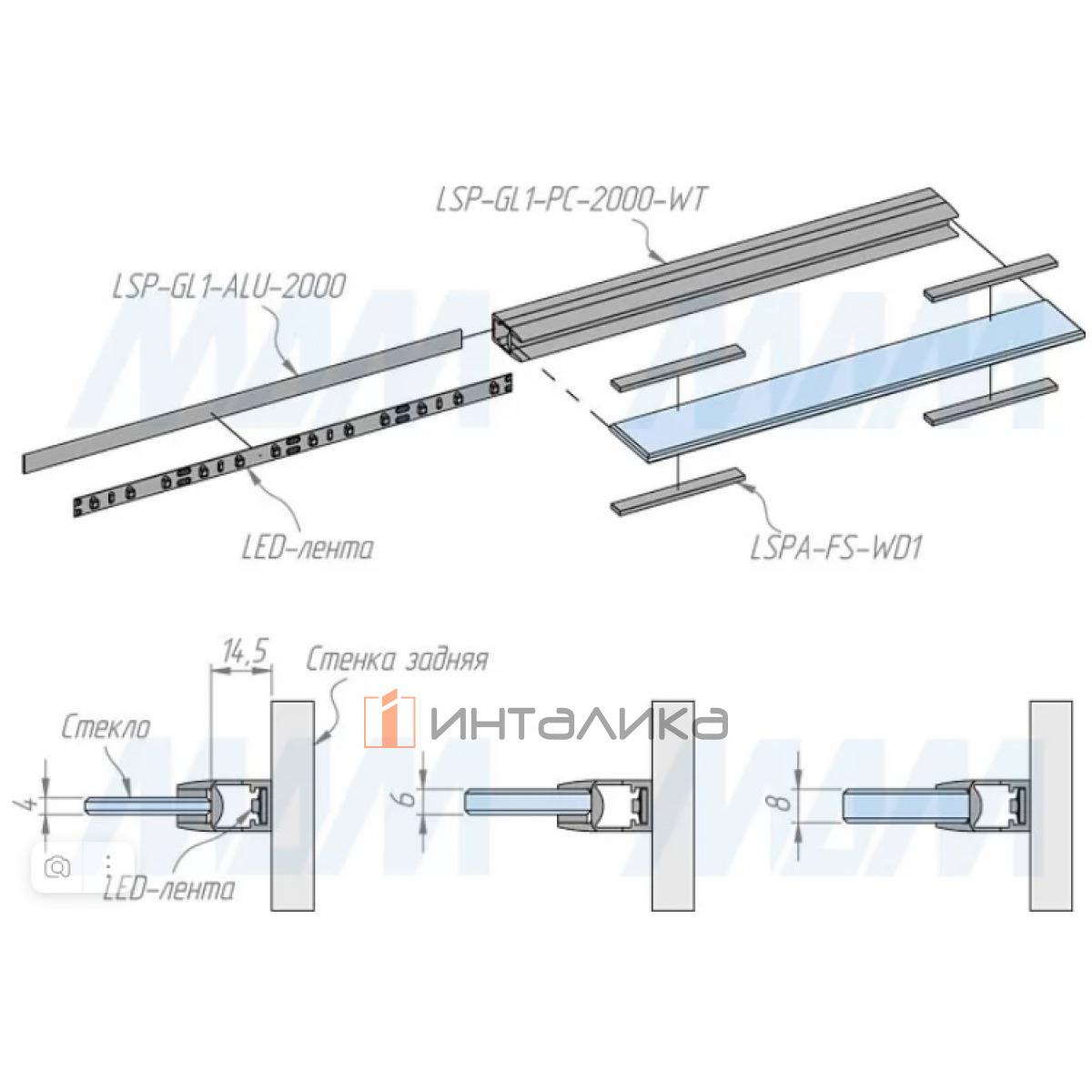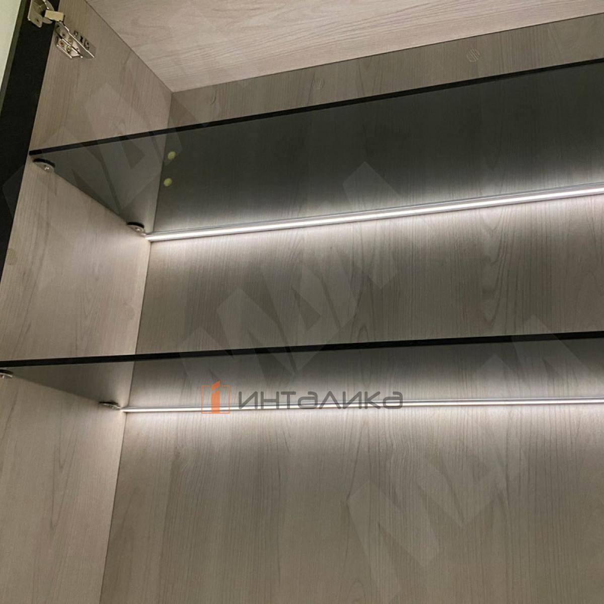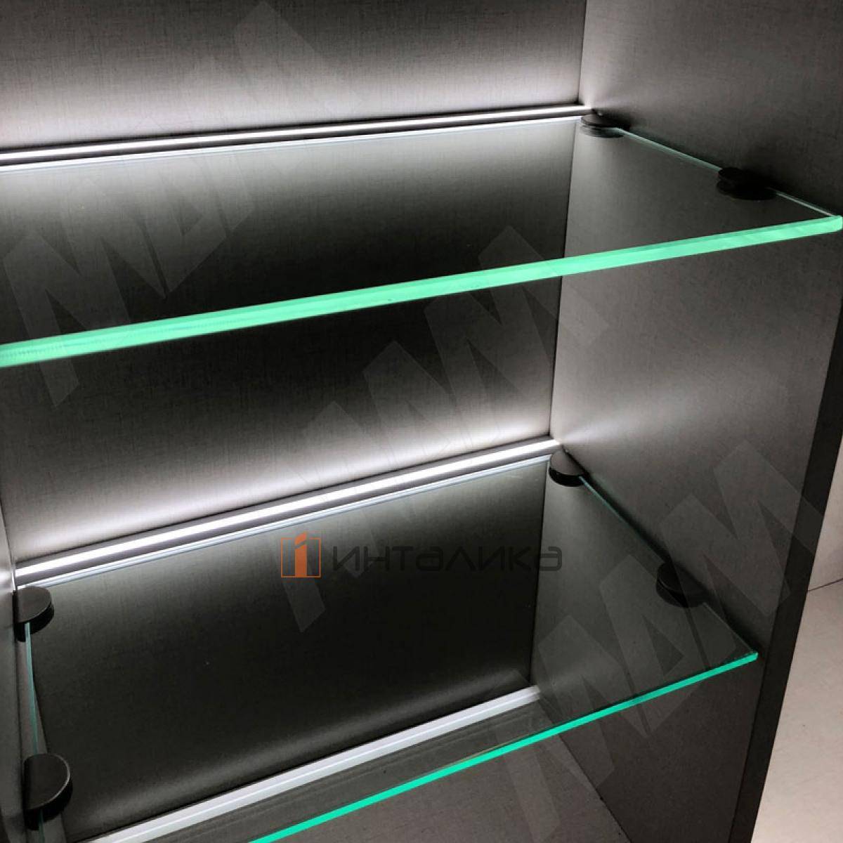 Применение: профиль для установки светодиодной ленты шириной до 8 мм для торцевой подсветки стеклянной полки толщиной до 8 мм