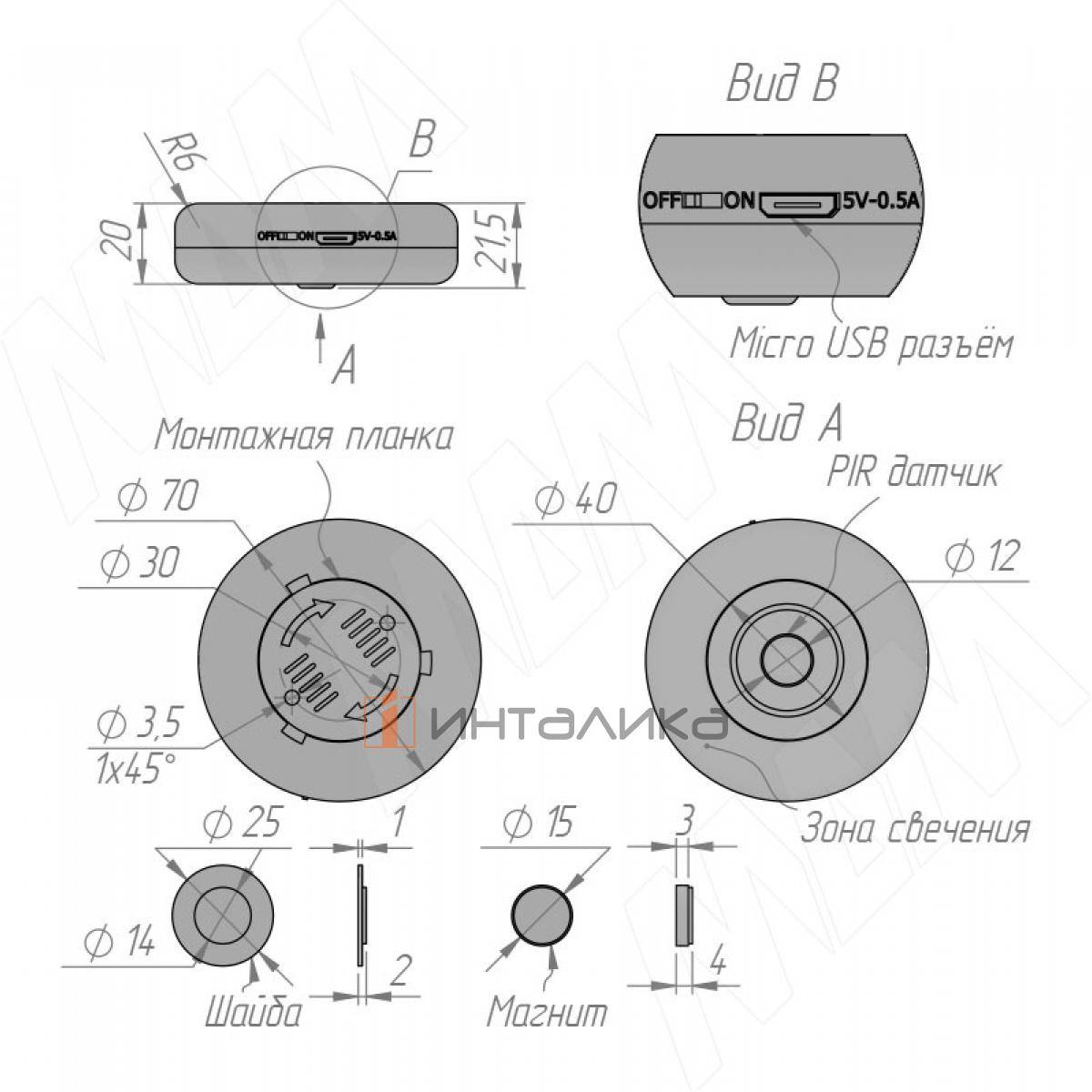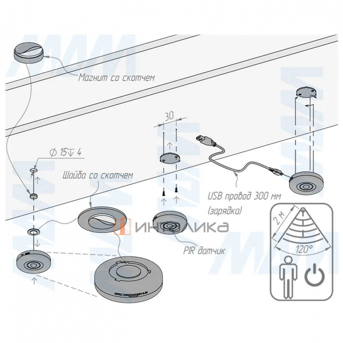 Комплектация: светильник, комплект для монтажа, USB-шнур для подзарядки