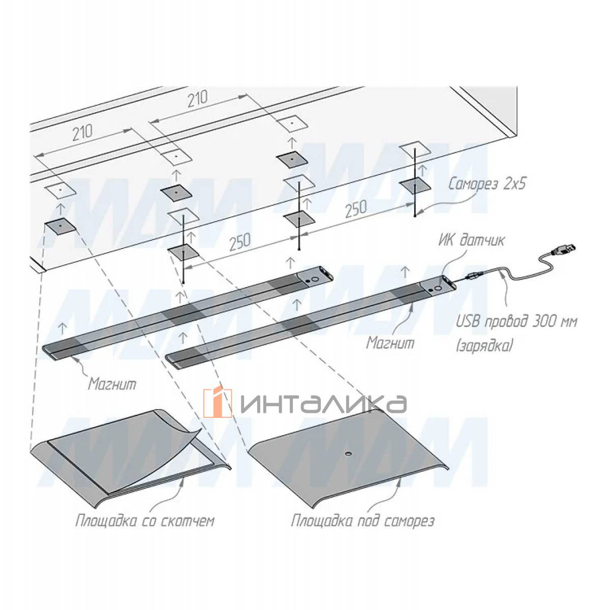 Комплектация: светильник, комплект магнитных клипс для монтажа, USB-шнур для подзарядки