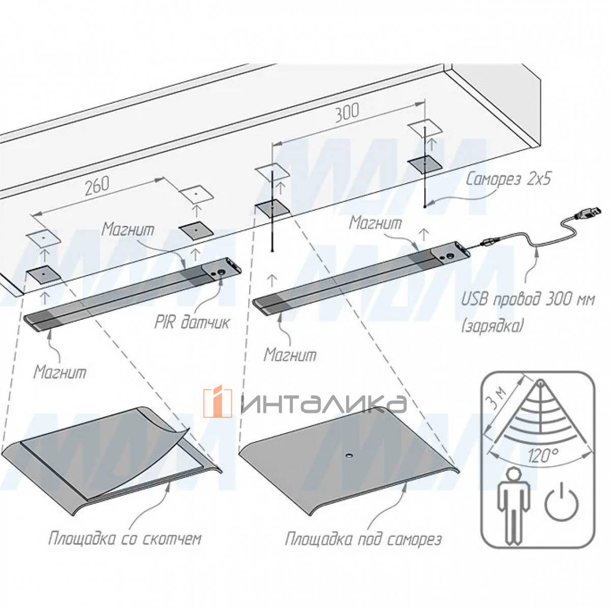 Комплектация: светильник, комплект магнитных клипс для монтажа, USB-шнур для подзарядки