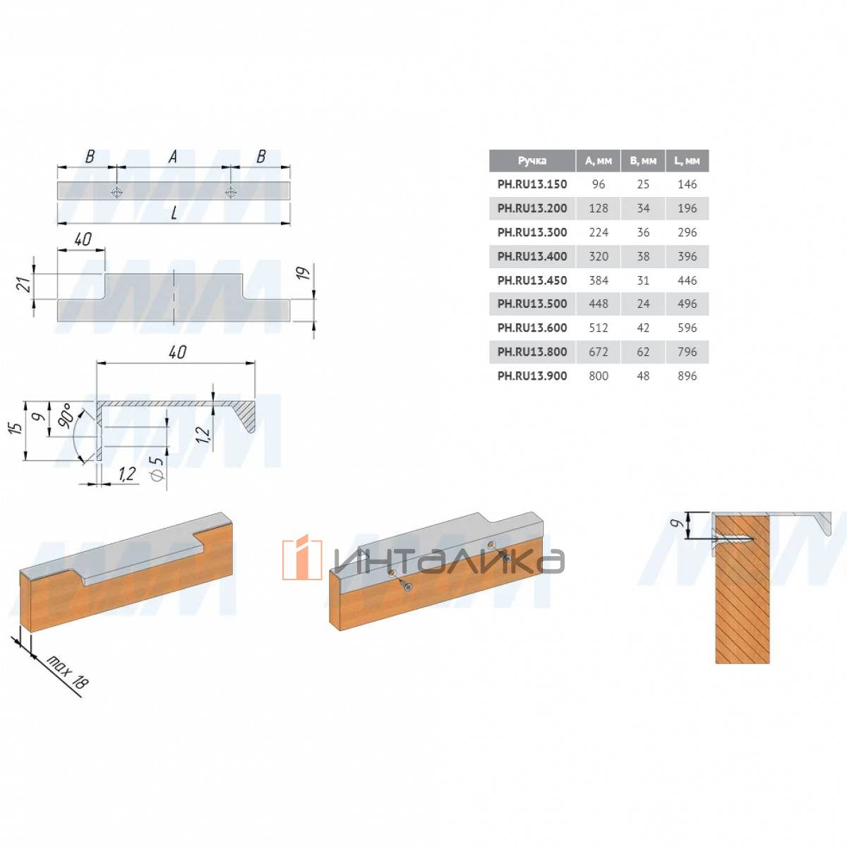 Профиль-ручка 446мм крепление саморезами черный матовый, PH.RU13.450.BL