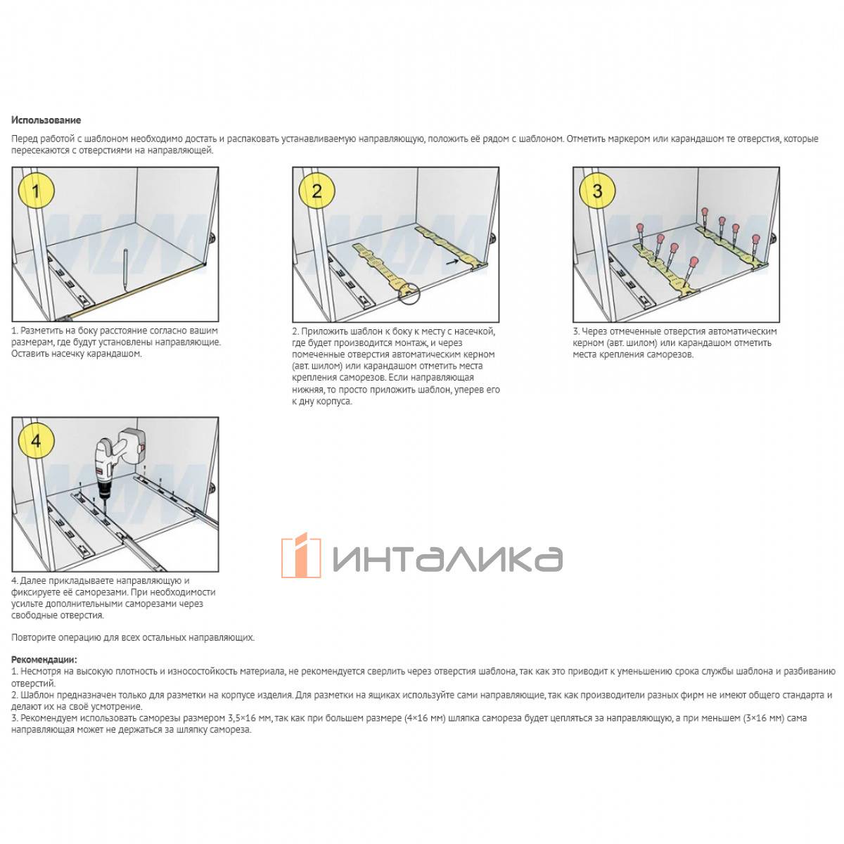 Шаблон позволяет при установке сохранить строгий угол 90° между направляющими и краем боковины, что исключит заедание и неполное закрытие ящиков при эксплуатации. Также благодаря правильной установке направляющих увеличивается их срок службы.