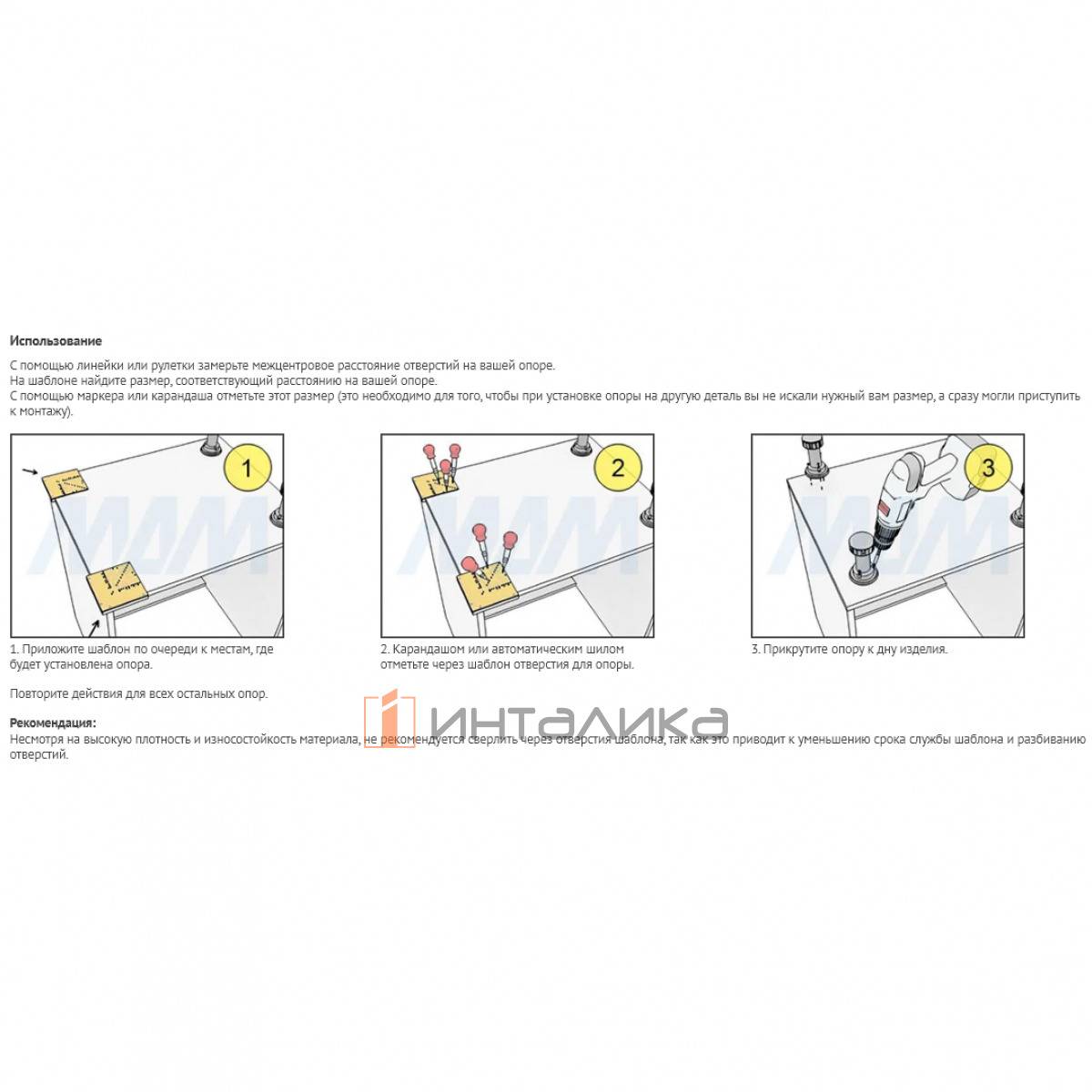 Шаблон Sh 6 предназначен для удобной и точной разметки отверстий, необходимых при установке мебельных опор.