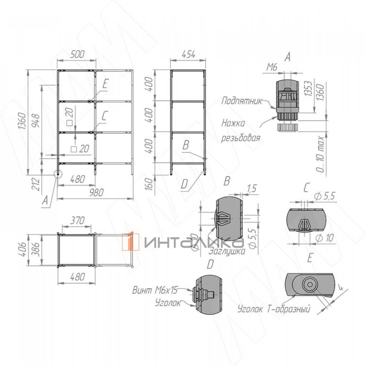 Комплектация: подпятник 20×20 мм М6 - 2 шт., ножка резьбовая М6 - 2 шт., заглушка 20×20 мм - 2 шт., винт М6×15 мм - 48 шт., заглушка D9–11 мм - 18 шт., ключ шестигранный S4 - 1 шт., проставка D16×15x20 мм - 2 шт., уголок T-образный - 8 шт., полка - 4 шт., стойка передняя - 1 шт., стойка задняя - 1 шт.