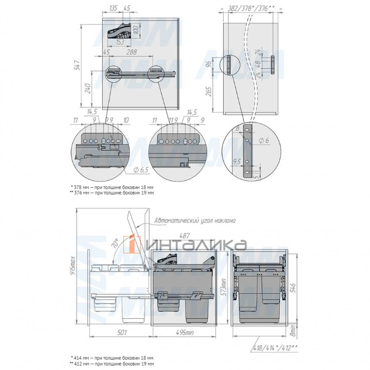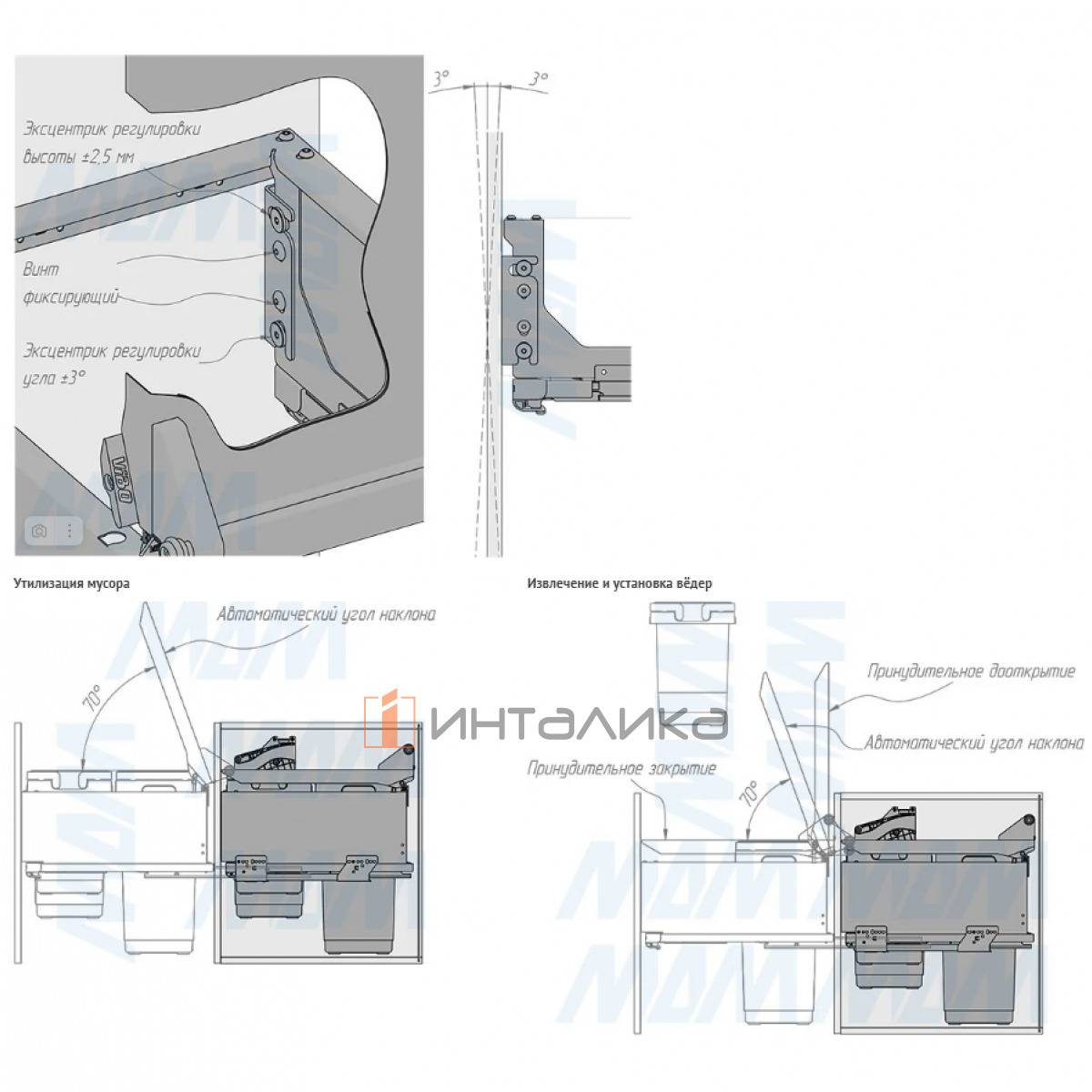 Комплектация: комплект рамы с предустановленной автоматической крышкой — 1 шт., направляющие для автоматической крышки — 1 компл., крепление фасада — 2 шт., ведро — 3 шт., ручка — 3 компл., направляющие — 1 компл., крепёж — 1 компл.
