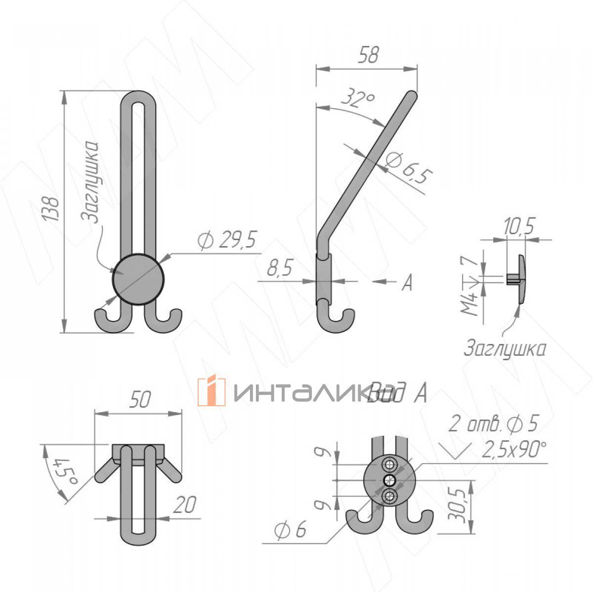 Комплектация: крючок с крепежом (саморез 4×25 мм - 2 шт., винт М4×20 мм - 1 шт., скотч двухсторонний)